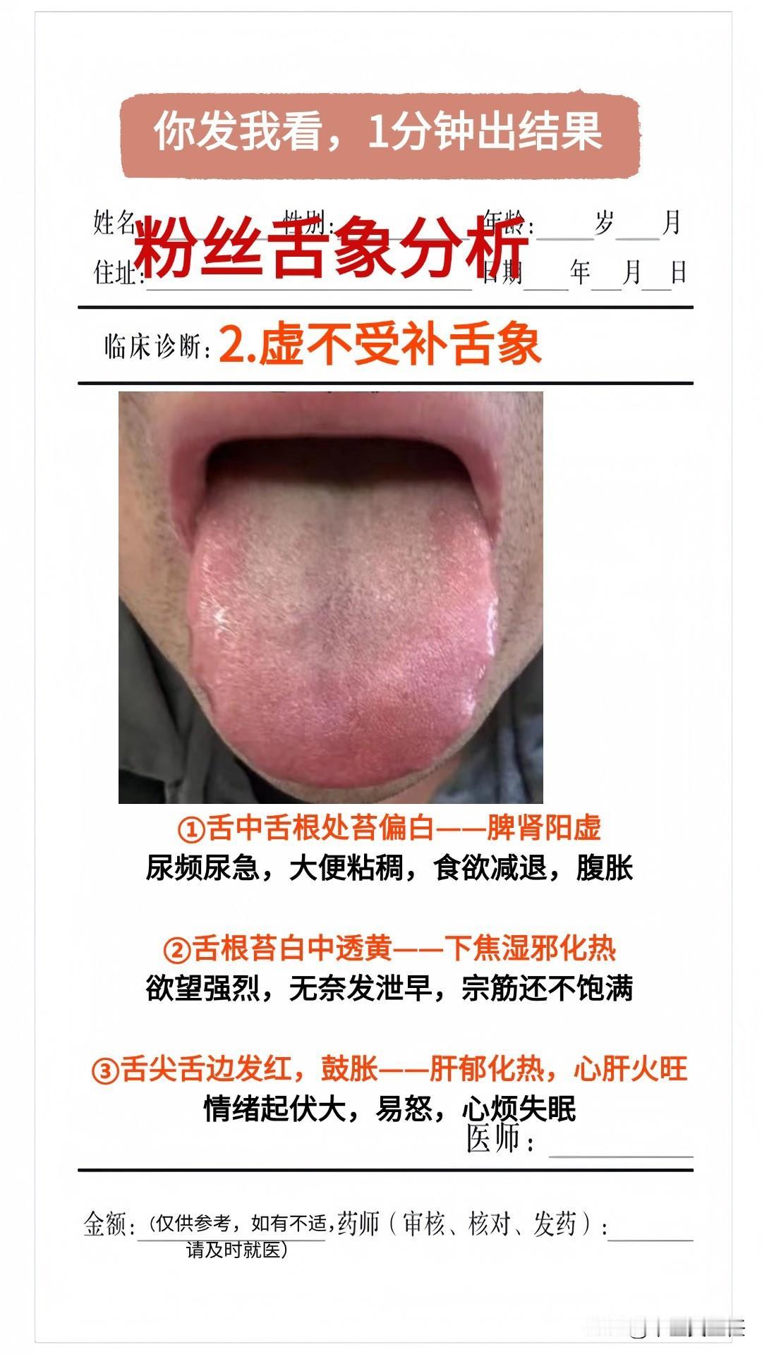 坚持公益看舌的第48天,本月已经看了325个舌象!你拍,我看,1分钟现出结果! 注意舌头尽量拍全! 下面这三个粉丝:就非常典型!我单独讲讲 1.真寒假热(舌苔发黄发腻,但舌质淡白) 2.虚不受补(虽有脾肾阳虚,但还有湿热和心肝之火,一补就会上火) 3.肝郁克脾(肝郁克脾,脾虚生成气血不足) #舌诊##中医#
