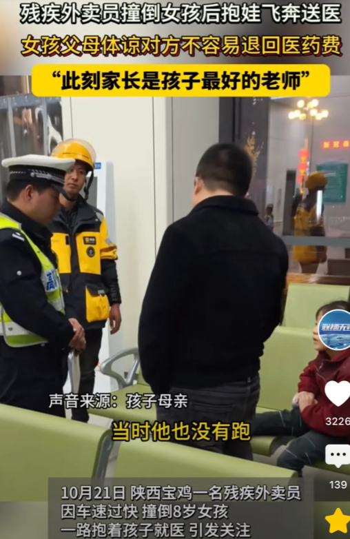 陕西宝鸡,一外卖员在送餐时,不小心撞倒了一名8岁女童,外卖员放下手上的外卖,一路抱着小女孩来到了医院挂了急诊,孩子父母得知后非常气愤,打算来医院质问外卖员,甚至还报了警,不过,在看到外卖小哥的手臂后,父母当即消了气甚至还不追究了。