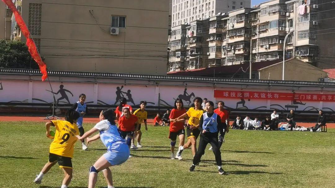 三门球是在综合了橄榄球、手球等多种球类运动特点的基础上,设计出的一种让三个队同在一个设置有三个等距离球门的圆形场地上用手打球,以将球有效的射入对方任何一个球门得分为目的而建立起具有攻二防二的独特竞赛体系的新型球类运动。比赛对抗性很强,对学生的跑动和敏捷性要求较高,三路比赛、双向联防还能很好地培养学生的合作共赢意识。