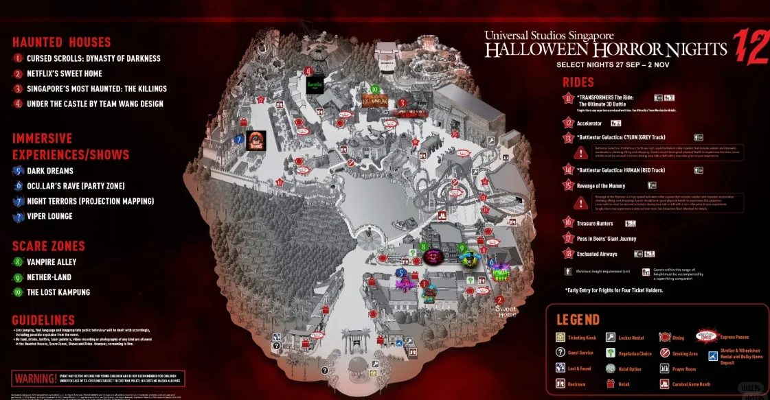 包含四大鬼屋、惊悚区、精彩的现场表演和刺激的游乐设施