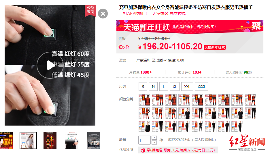 在网络销售平台上,搜索关键词“充电保暖衣”“电热内衣”,可以找到类似款的保暖衣。有的商家直接打出“李某同款”的字样,售价从100余元到600余元不等。
