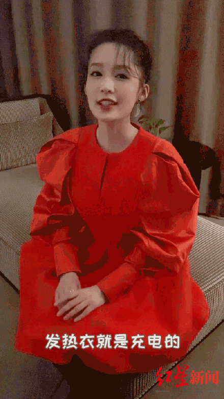 “发热衣就是充电的,我在剧组拍戏的时候就会穿这个。发热衣有一个电池,(按下发热衣上的按钮,不同颜色灯光显示不同档位),红色是最高档,还可以选蓝色、绿色。发热衣是装电池的,电池需要充电。”李沁在视频中介绍,“我现在(在室内)不能开(红色档位)了,不然就太热了,我已经在发热了。”