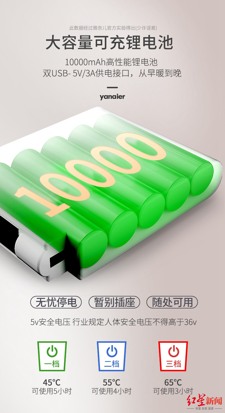 它可以加热到多少摄氏度呢?有商家号称的三挡调温,温度分别为“高温60度、中温55度、低温45度”,还有商家表示,最高档位温度可以升至65度。