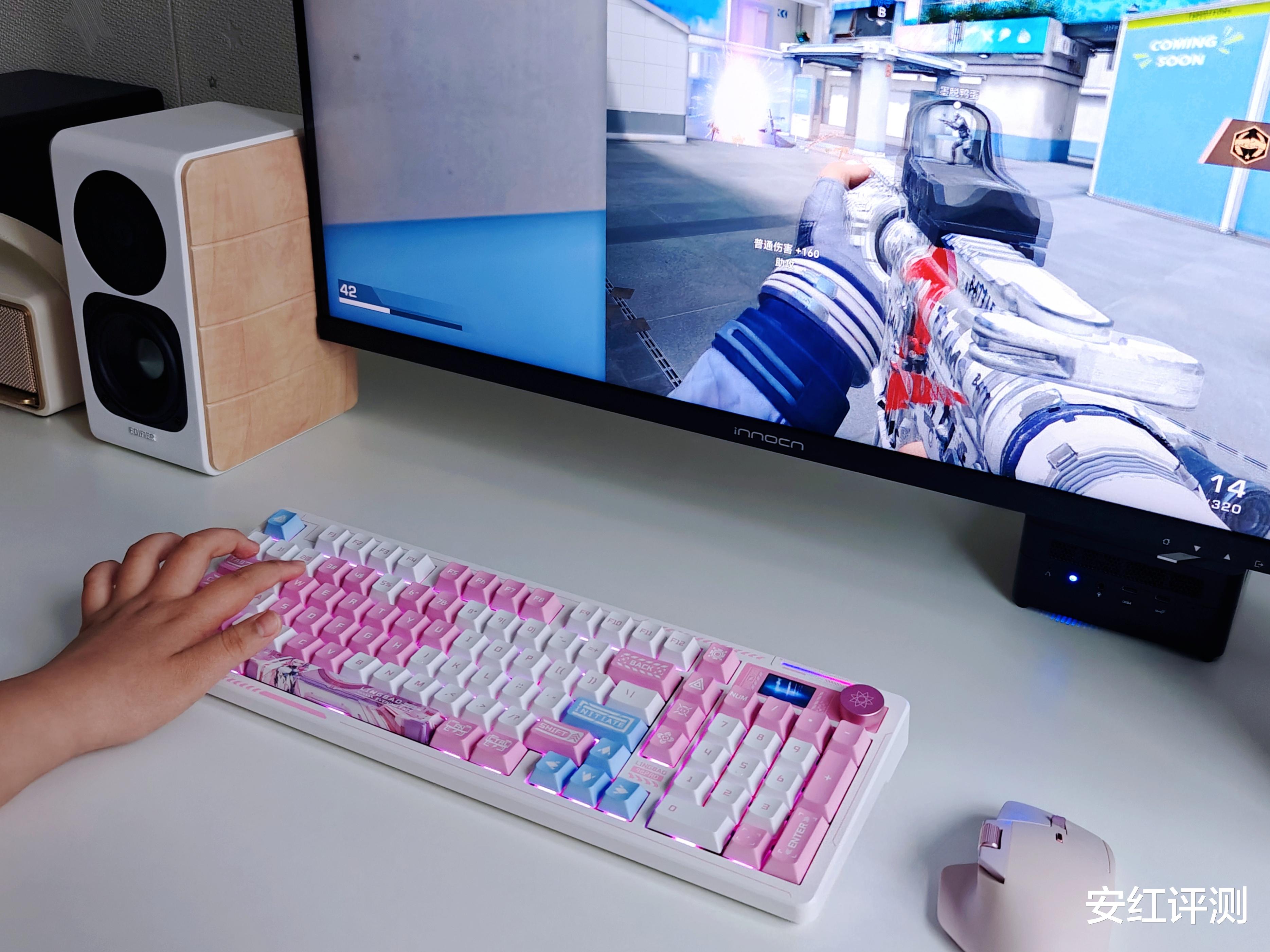 键盘采用了下灯位设计,肉眼可见的灯光更均匀柔和,敲字时,指尖像在流光中跳舞,配上蓝、白、粉的键帽,工作时也多了一点仪式感。日常使用随心切换背光灯效,游戏娱乐自带电竞氛围。