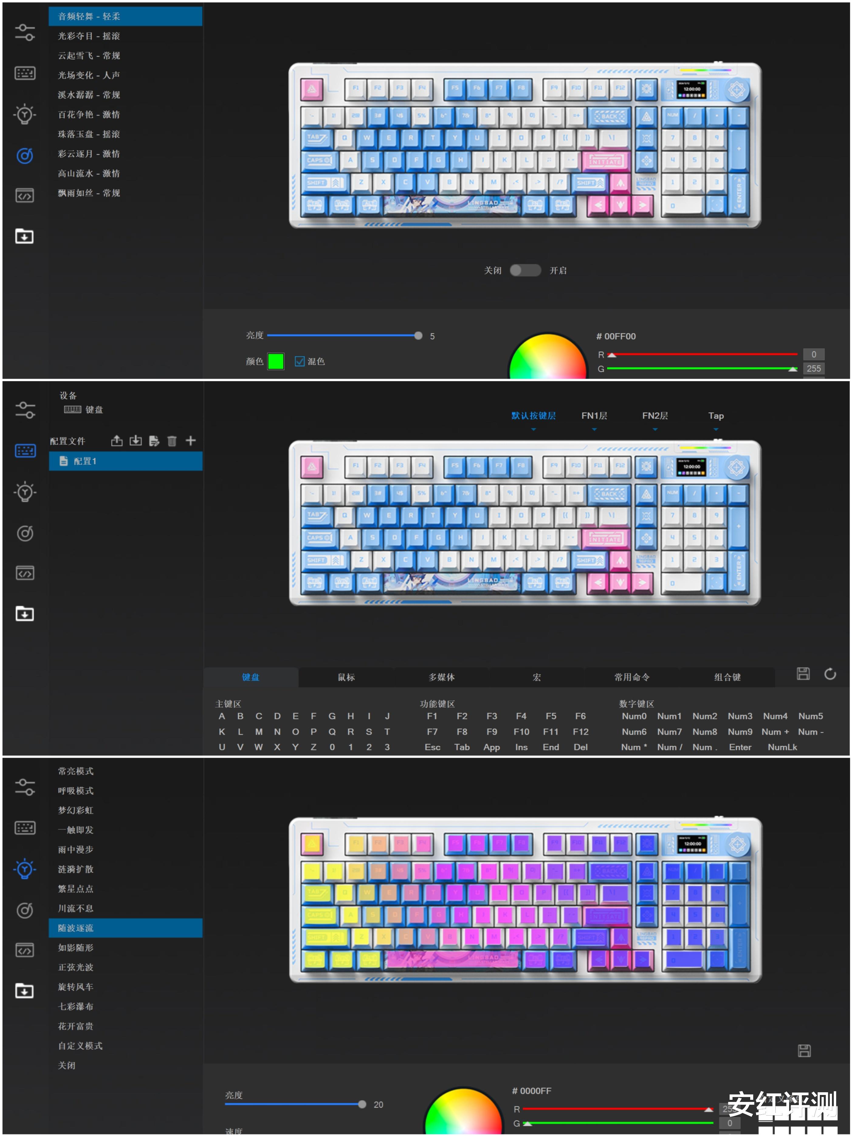 凌豹K98Pro采用侧翼流光灯带和个性灯带的设计,简直是整个键盘的灵魂,通过FN+常用键切换侧翼流光灯带和个性灯带调节,实物超乎预期的好看,侧翼流光灯带和个性灯带的光效真的美翻了。