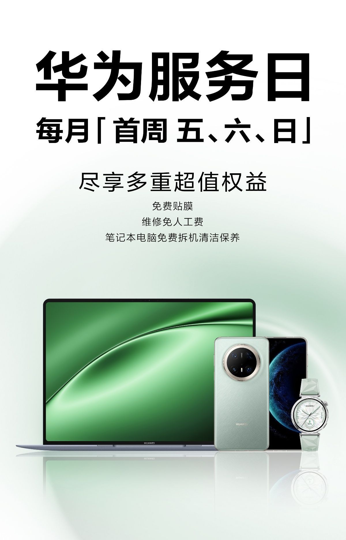 华为服务日活动自2017年启动以来,始终坚持每月首周五六日为消费者送去暖心服务与贴心关怀。2025年,华为服务日更是进行了焕新升级:在原有免费贴膜、维修免人工费、免费外观清洁保养等基础上,针对笔记本电脑、穿戴设备等多品类推出更多元、更实用的福利,为消费者带来更具温度的服务体验。