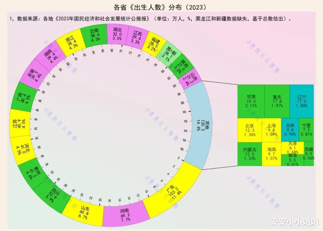 2023年,全国902万出生人口中,有103万来自人口第一大省广东省,占全国的比例为11.4%。