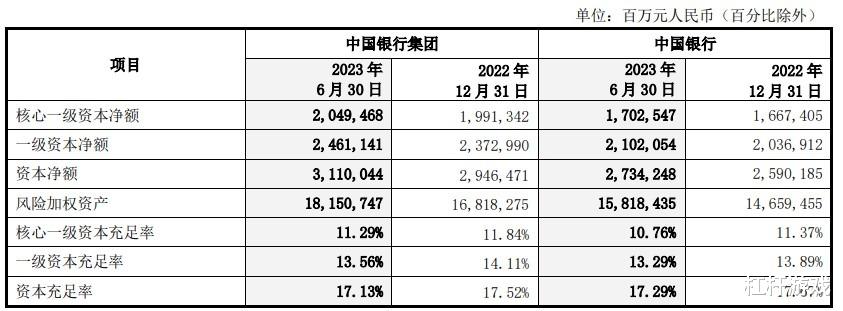 就整个中国银行集团来说,截至2023年6月末,核心一级资本充足率11.29%,2022年末时则有11.84%;一级资本充足率13.56%,2022年末为14.11%;资本充足率17.13%,2022年末为17.52%。