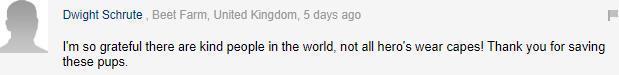 “感激这个世界上善良的人。不是所有的英雄都披着斗篷!谢谢你拯救了这些小狗。”