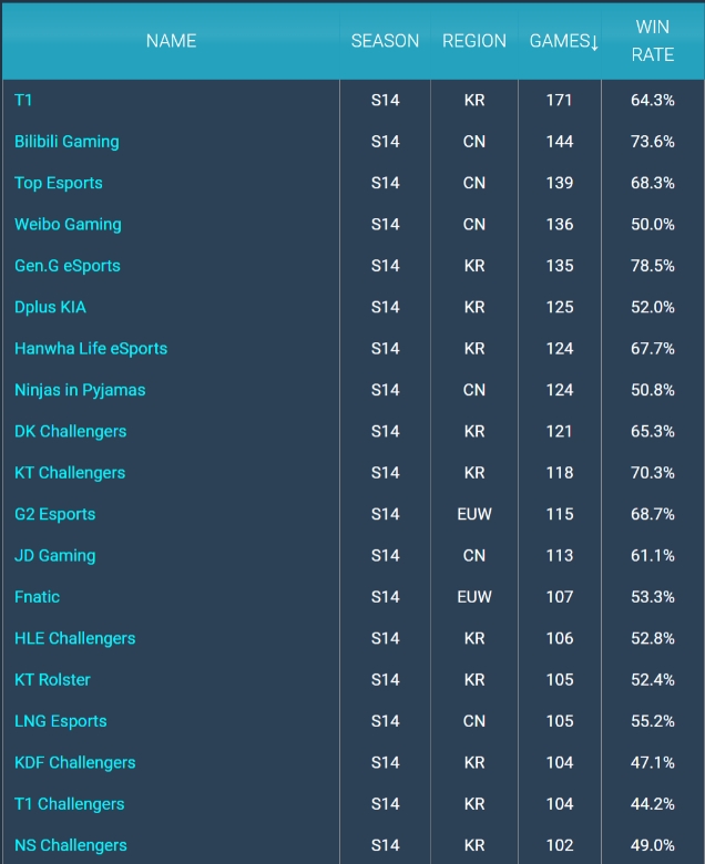 直播吧10月29日讯S14决赛将于11月2日正式打响,根据GOL.GG的数据显示,S14赛季目前为止比赛场数排名,T1以171场位列第一,第二到第四的队伍分别为BLG、TES、WBG。