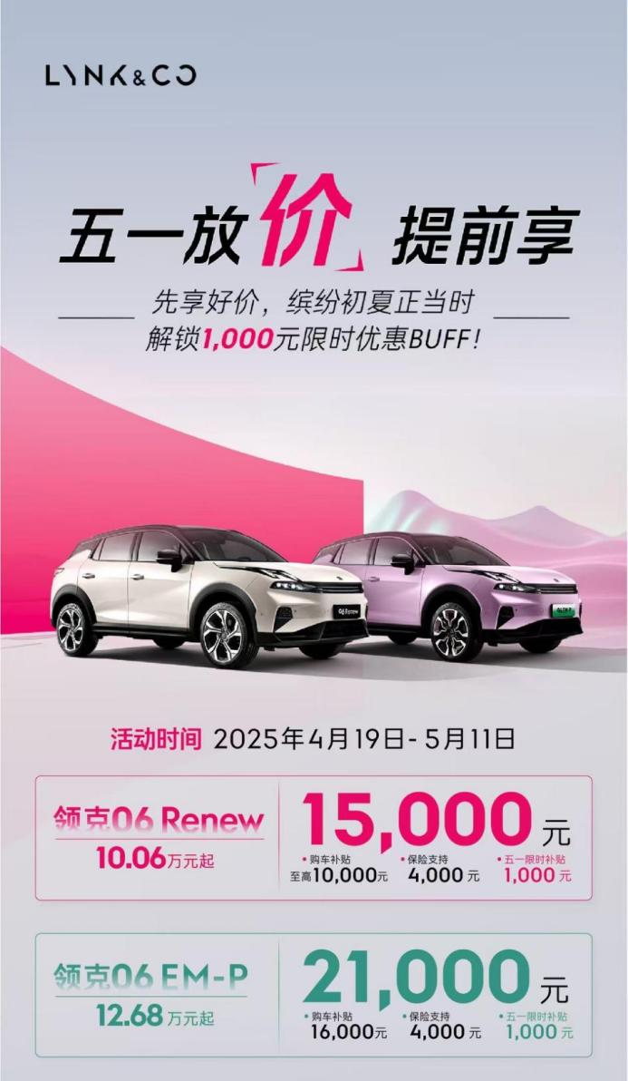 价格方面,领克06也十分“亲民”。在2025年4月19日 - 5月11日活动期间,购买领克06家族可享受1000元五一限时补贴等多项优惠。补贴后,领克06 Renew限时专享价10.06万起,领克06 EM-P限时专享价12.68万起。