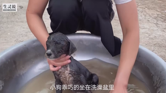 看着它全身脏兮兮的毛发,小哥决定给小黑洗一个澡,让它缓和振作起来,小狗乖巧的坐在洗澡盆里,看着浑浊不堪的水,想必这只小黑狗已经在外面流浪了很长的一段时间,简单的清洗之后,小哥和家人用简易的纸箱为小狗做了一个狗窝,希望这样可以给小狗带来温暖