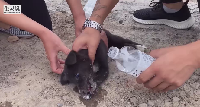 于是立马反应过来,小家伙或许是吃了不干净的东西中毒了,于是小哥连忙回到车上拿出两瓶水,不断的对着小黑狗的嘴灌起来,目的就是稀释小狗吃下的有毒食物,忙碌了一番,小黑狗依旧是没有任何好转