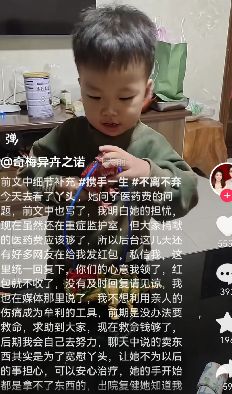 第二,现在和医生交谈之后,确定基本治疗费用已经够了,但是现在还有热心粉丝给发红包,老公表示不收了,好意心领了,不想拿妻子赚钱。