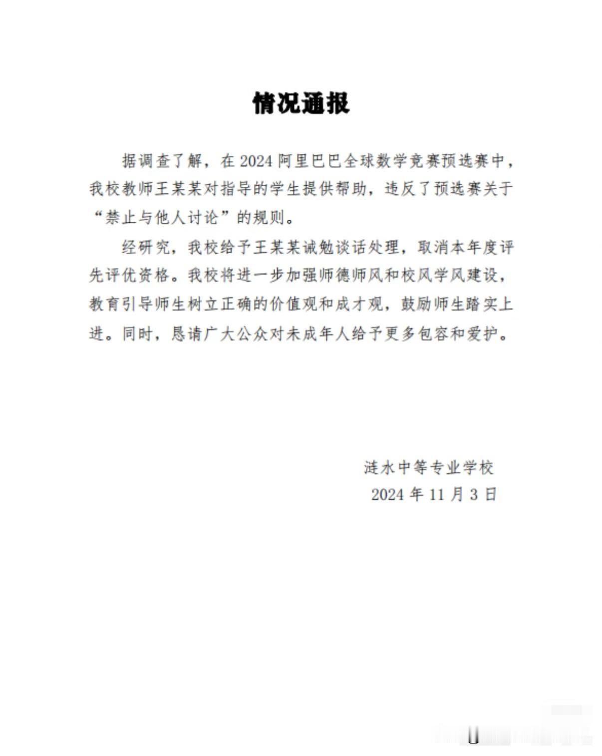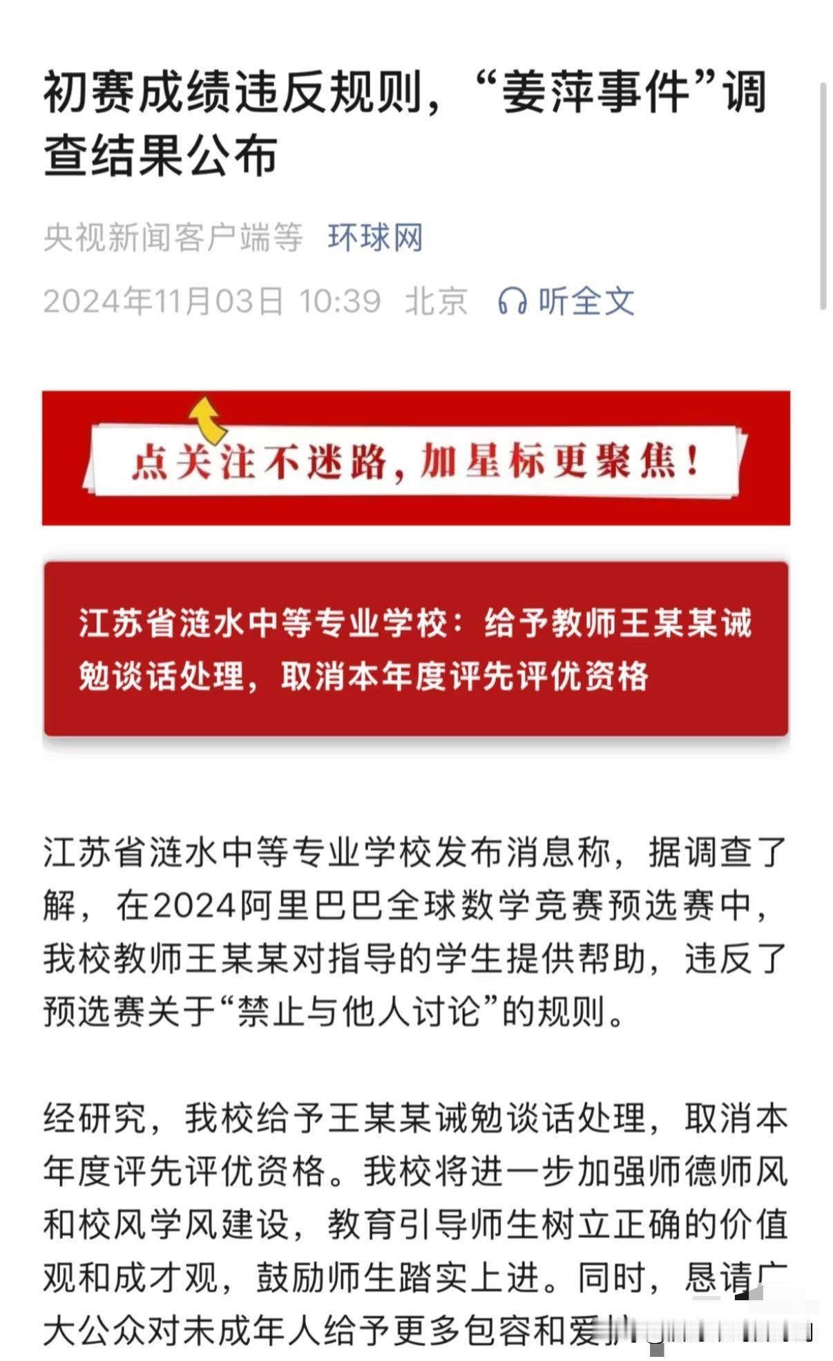 天才少女姜萍事件尘埃落定,让人唏嘘不已 关于姜萍在数学竞赛中是否作弊的问题,经过调查和核实,确实存在作弊行为,具体情况如下: 在阿里巴巴全球数学竞赛预选赛中,姜萍的老师王某某对其提供了违规帮助,违反了预选赛关于“禁止与他人讨论”的规则。这一行为被认定为作弊,导致姜萍在预选赛中的成绩被取消。 阿里巴巴全球数学竞赛组委会在调查后,发布了情况说明,确认姜萍在预选赛中作弊,并取消了她的获奖资格。 姜萍的母校江苏省涟水中等专业学校也对此事进行了处理,给予王老师诫勉谈话处理,并取消其本年度评先评优资格。同时,学校表示将进一步加强师德师风和校风学风建设。 姜萍的作弊行为引起了社会的广泛关注,大家对此表示震惊和失望。原本,姜萍作为中专生在数学竞赛中取得优异成绩,被大家誉为“数学天才”,她的故事激励了许多人。然而,作弊事实的揭露让她的形象一落千丈,也引发了大家对教育公平和诚信问题的思考。 对于这件曾在网络上掀起巨浪的事件,竞赛组委会和学校都应该反思。竞赛组委会加强对竞赛过程的监管和管理,确保竞赛的公平性和公正性。学校应该加强对学生的诚信教育和引导,让他们树立正确的价值观和成才观。 姜萍在数学竞赛中作弊的事实已经得到了确认和处理,希望大家能够从中汲取教训,坚守诚信原则。