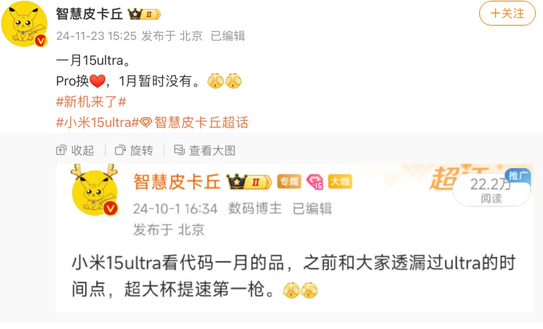 另外就是小米这边的消息了,上个月末才发布小米15以及 15 Pro 两款新机,据数码博主 @智慧皮卡丘 爆料,小米15 Ultra 会在明年 1 月份发布。