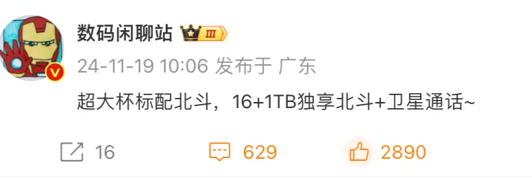 另外据爆料,小米15 Ultra 还将标配北斗(此处预计指北斗卫星通信),16+1TB 版本独享北斗 + 卫星通话。