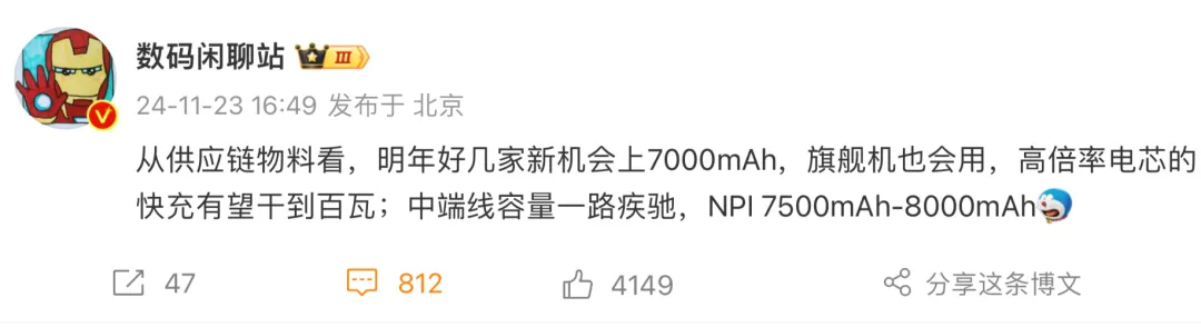 然而电池技术并没有止步于此,而是继续扩容。据数码博主 @数码闲聊站 发文称:“从供应链物料看,明年好几家新机会上 7000mAh,旗舰机也会用,高倍率电芯的快充有望干到百瓦;中端线容量一路疾驰,NPI(新产品导入)7500mAh-8000mAh。”