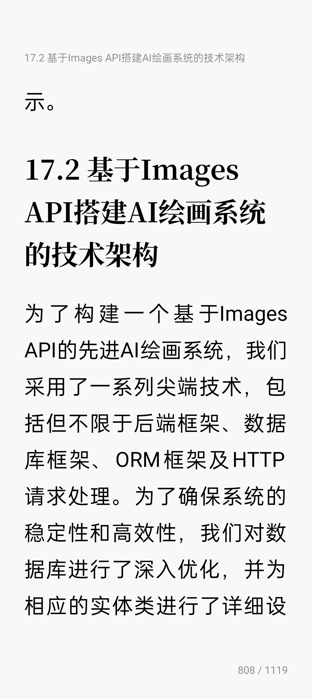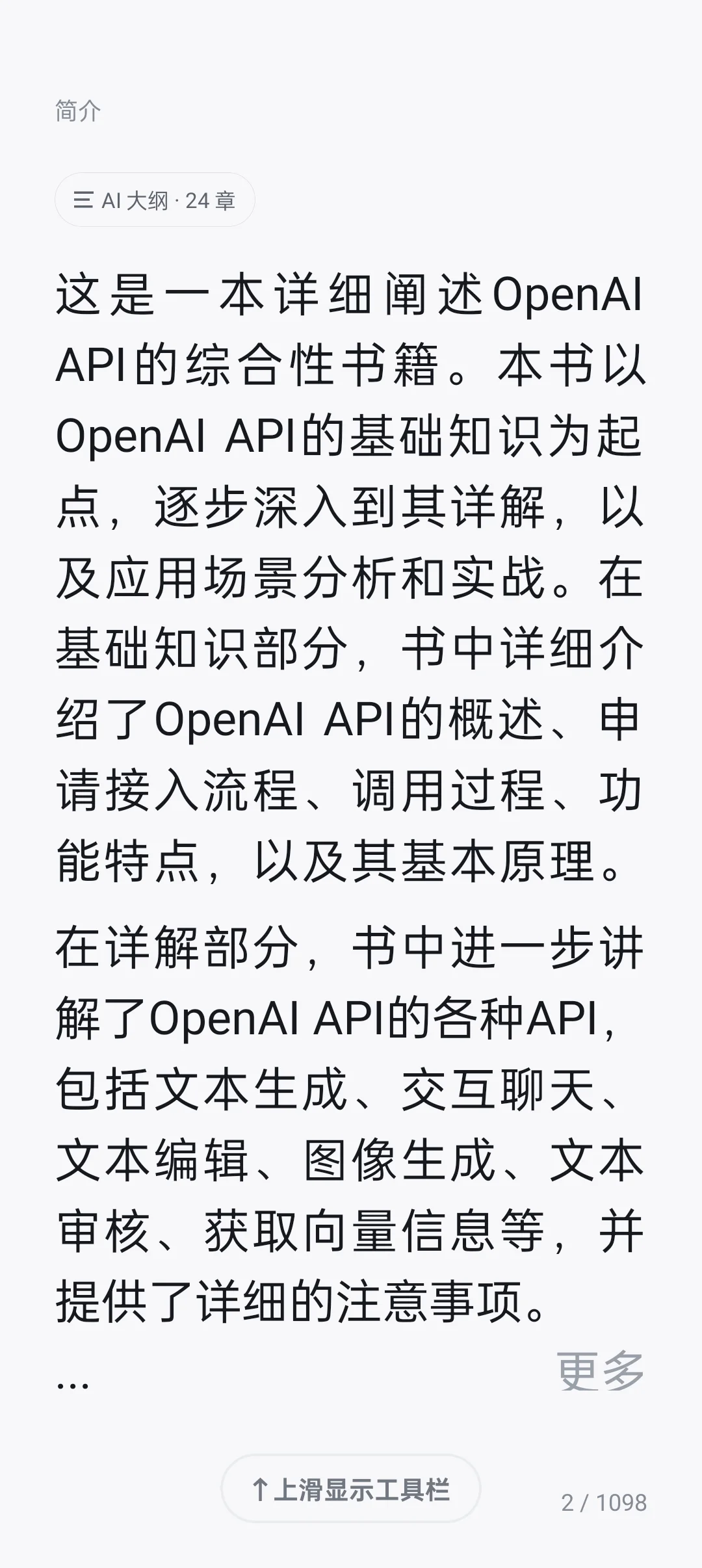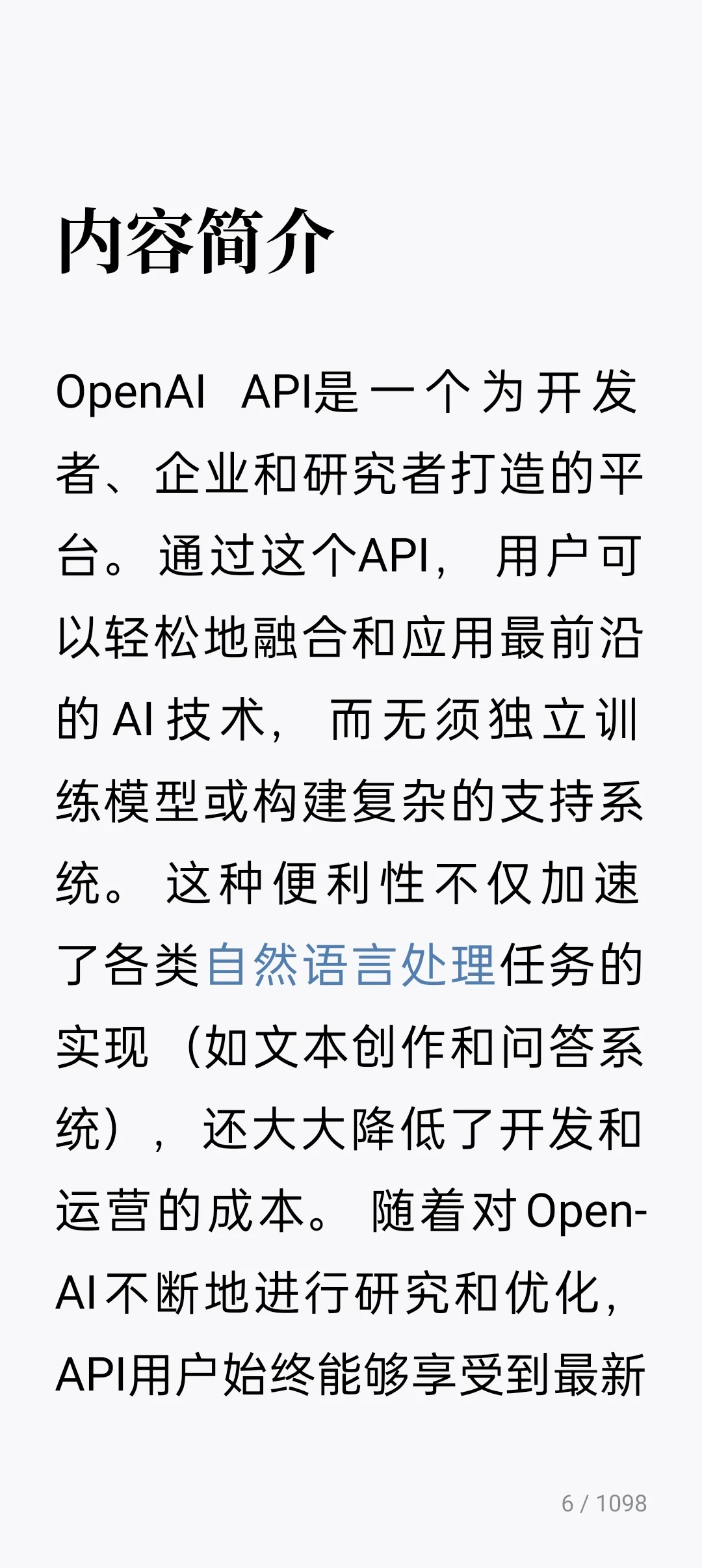总之,OpenAI API不仅推动了AI技术的广泛应用,还为广大用户提供了一种简单、高效的方式来探索和实现AI的潜能。 本书分4篇,共19章,涵盖的主要内容有OpenAI API的基础知识、OpenAI API详解,使用OpenAI API实现智能问答、在线客服、教育辅导、编程助手、情感咨询、心理咨询、内容创作、旅行规划、法律咨询、多语言翻译、市场分析、文献检索等功能,开发工作准备、聊天机器人实战、AI绘画系统实战、AI文本审核系统实战,以及OpenAI API展望等。