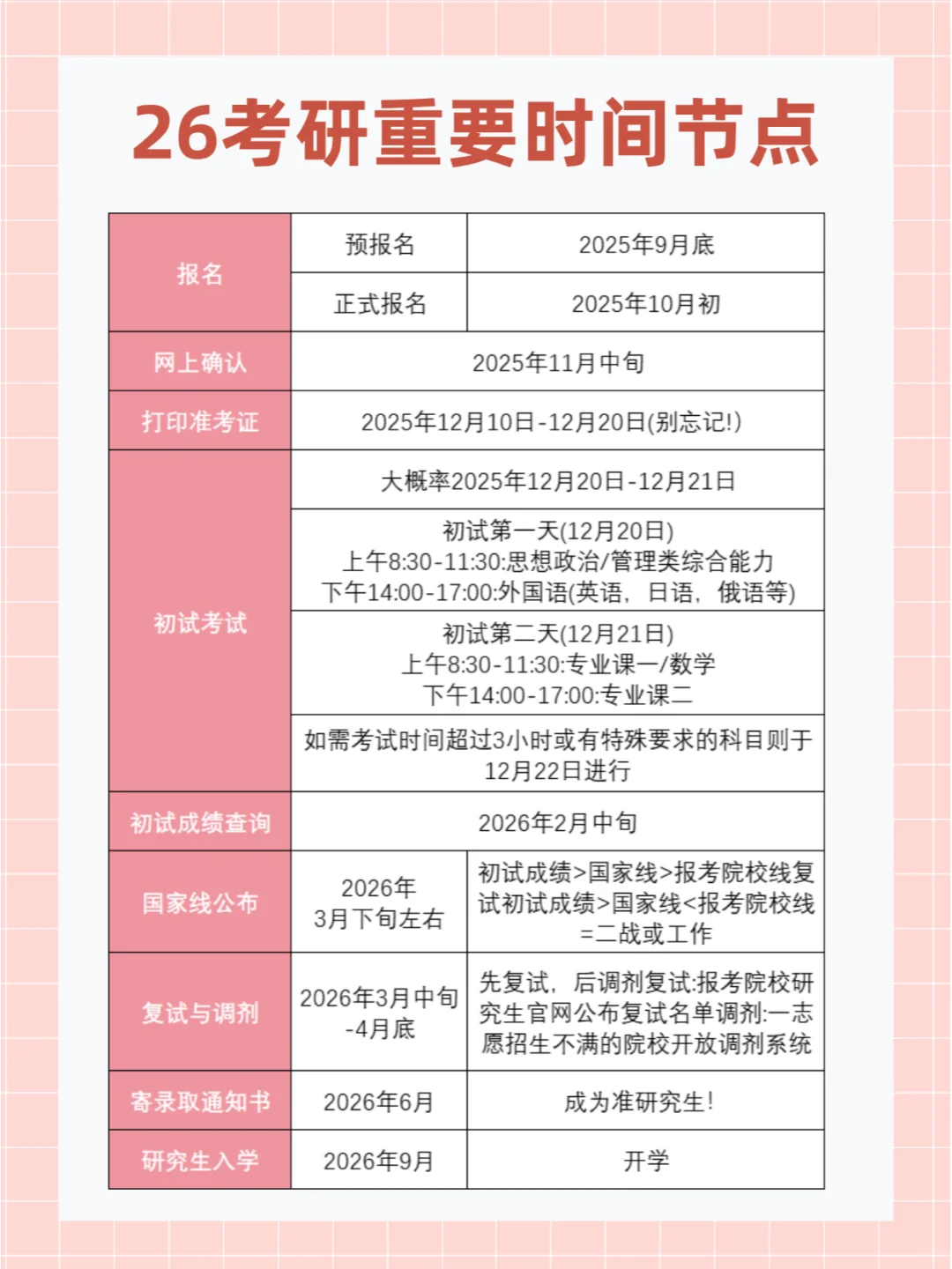 25考研马上开始,26考研的同学们有没有一丝紧迫感呢?看到积极的同学已经开始加入备考大军,为了26考研奋战了 - 这里为大家整理了26考研的重要时间节点,一起来看看喔~