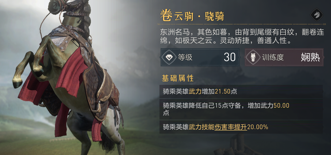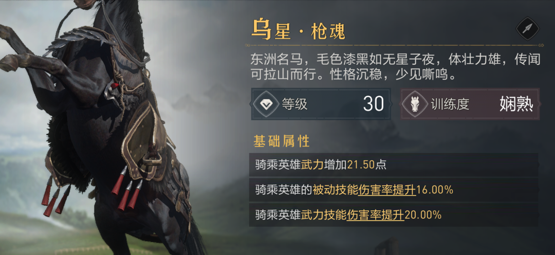 想要知道答案的话,就要寻找两个合适的坐骑进行对比。我这里想到的是卷云驹和乌星,因为这两个坐骑除了第二条属性之外,其余的属性是完全相同的,能够很直观地看出概率触发和增加属性哪个效果更好。满级后卷云驹是加50武力减15守备,特性相符30%加成后为65点武力,乌星为被动技能伤害率提升16%,特性加成后变成20.8%。下面我们分别将这两个坐骑装备给项楚,来看下效果。1点属性对技能的影响是0.3%,65点就是提升19.5%伤害,以项楚为例,1红被动350%伤害率,卷云驹对其提升为350%×19.5%=68.25%,标配反戈一击1红为84%,提升为16.38%。同时武力还影响主将技350%的伤害率,再提升68.25%。