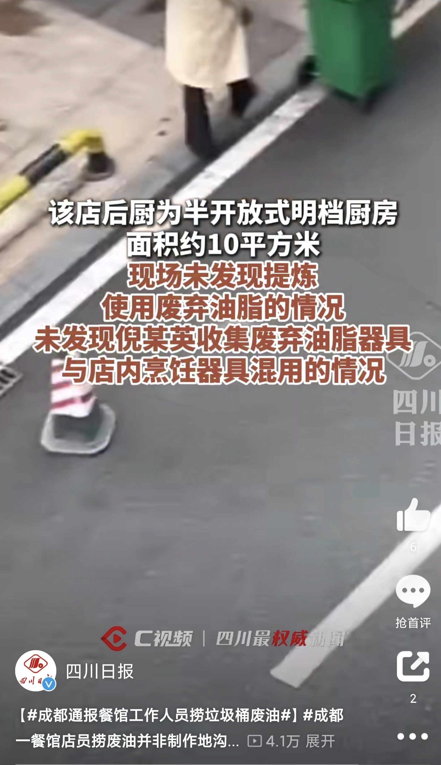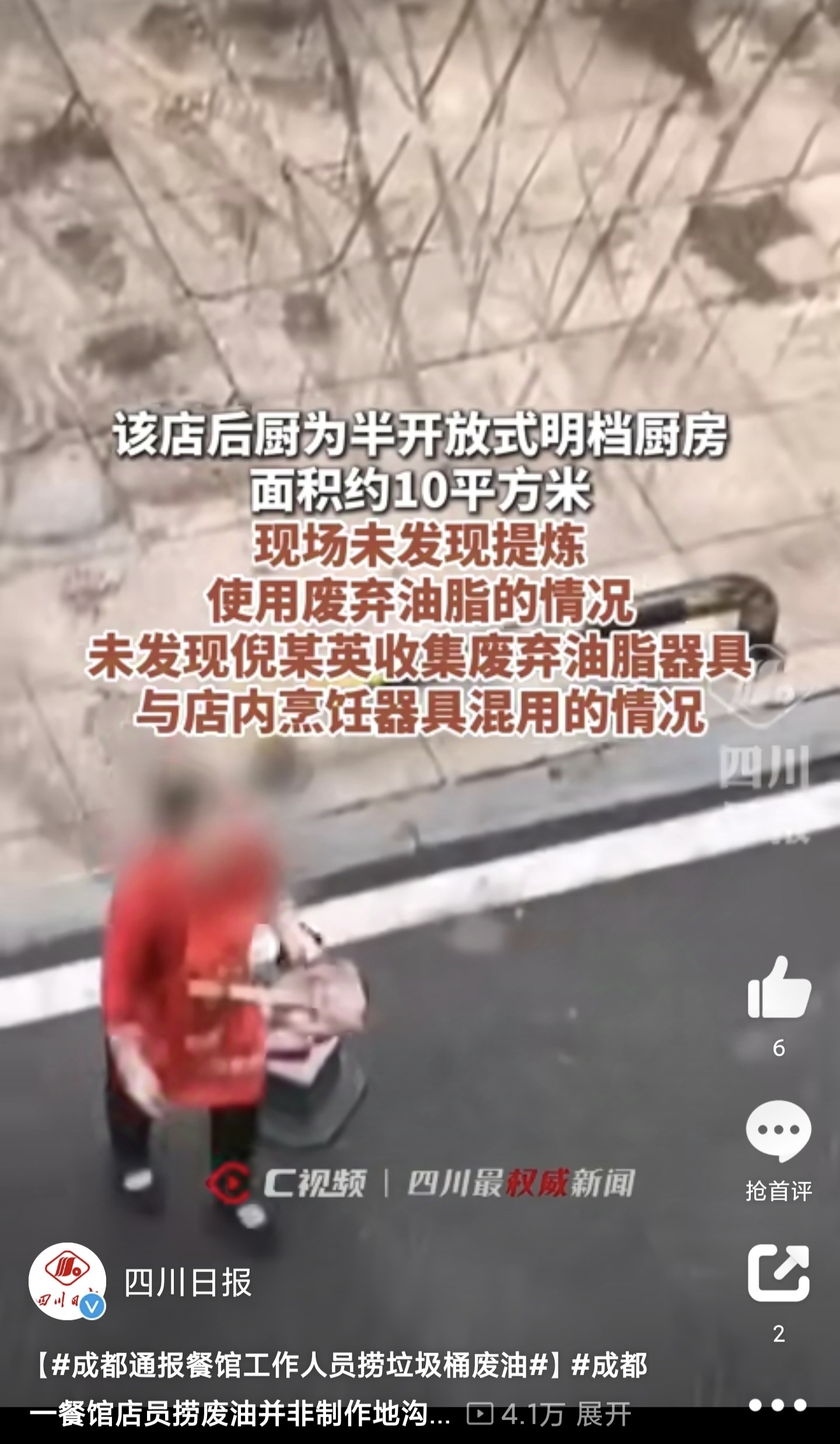视频传播后,引起了群众的极大关注,对于害人的“地沟油”更是深恶痛绝。餐馆店员手持勺子,在垃圾桶内捞取油脂的画面,不仅令人深感不适,更引发了公众对于食品安全的担忧。因此监管部门一定要严肃处理,查清流通方向,让大家了解背后的真相。