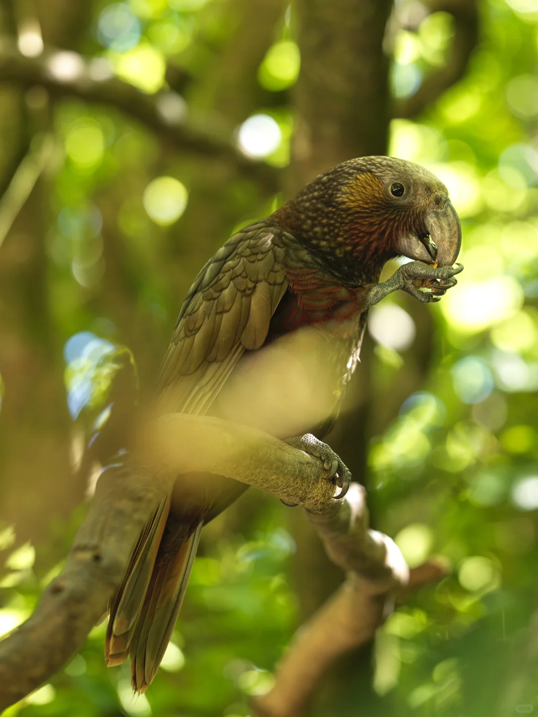 從鐵柵欄進入園區,彷彿進入電影侏羅紀公園的場景,深入這片原生生態,他帶我認識了新西蘭獨有的稀有物種。他不會使用鳥類這個統稱,每當聽見叫聲或是看見總能直接稱呼他們的名字,夜間你可以看到傳奇的奇異鳥Kiwi,鸚鵡kaka,牠們在樹冠間活躍地跳躍,到飯點會準時進食給遊客拍照。