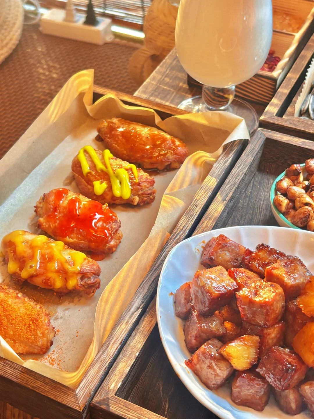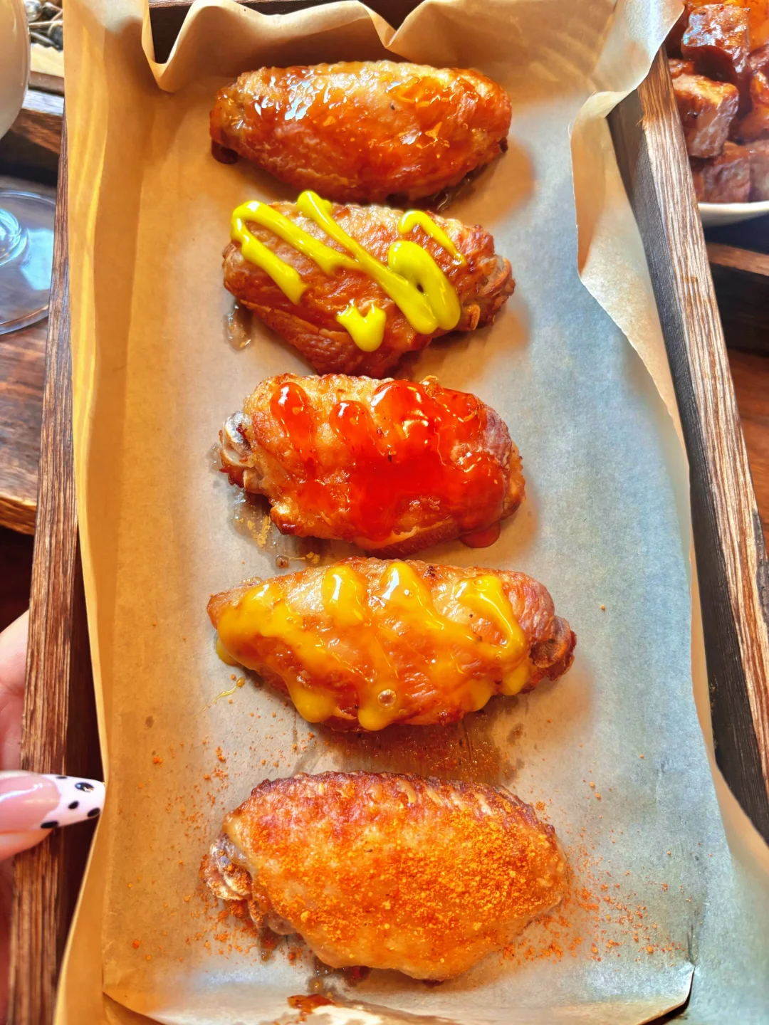 有几种不同口味的酱,放在烤好的鸡翅上,选择困难症的姐妹可能要纠结吃哪个了🧐但盲选也不会出错,因为都好吃~