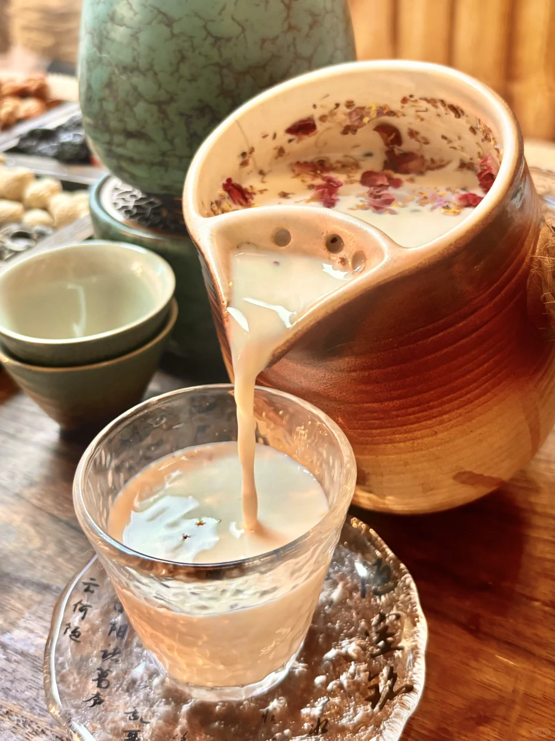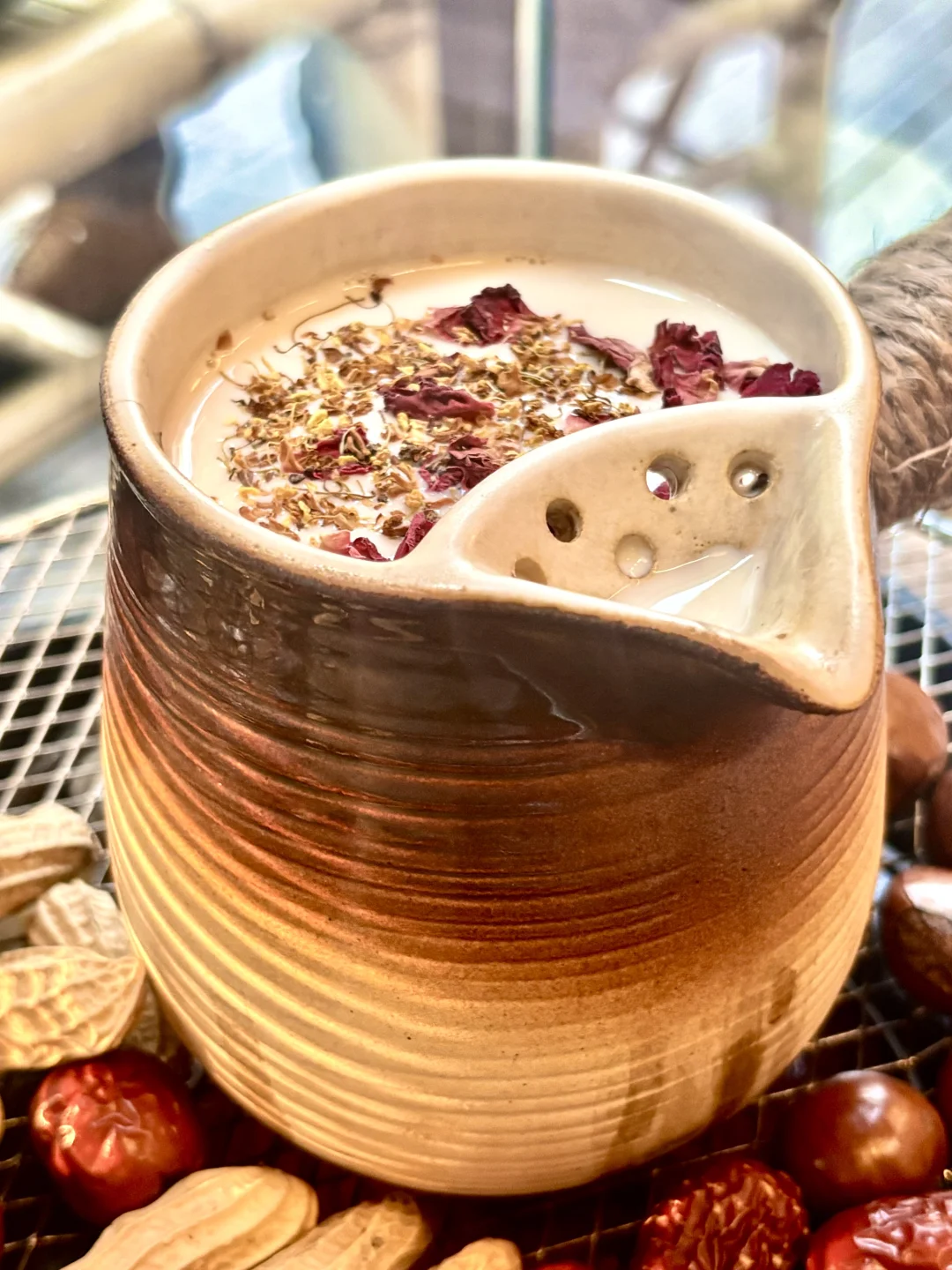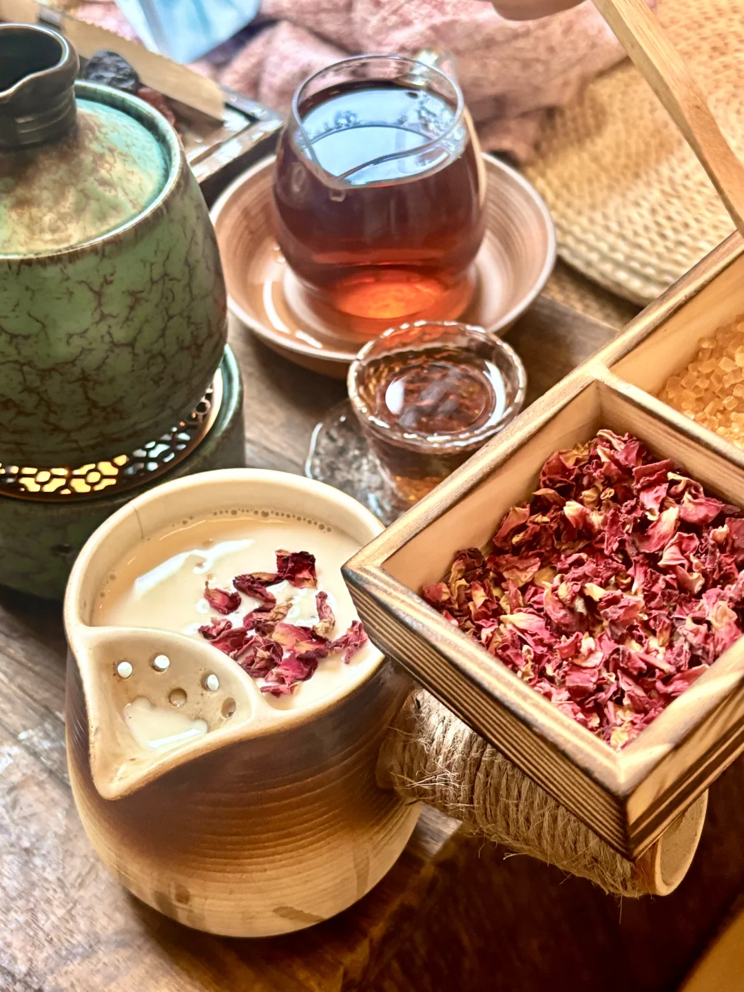 🥛烤奶,茶煮的差不多厚就可以加入牛奶了,再根据自己的喜好依次加入适当的玫瑰花…冰糖…就可以放在小暖炉上加热了哦~