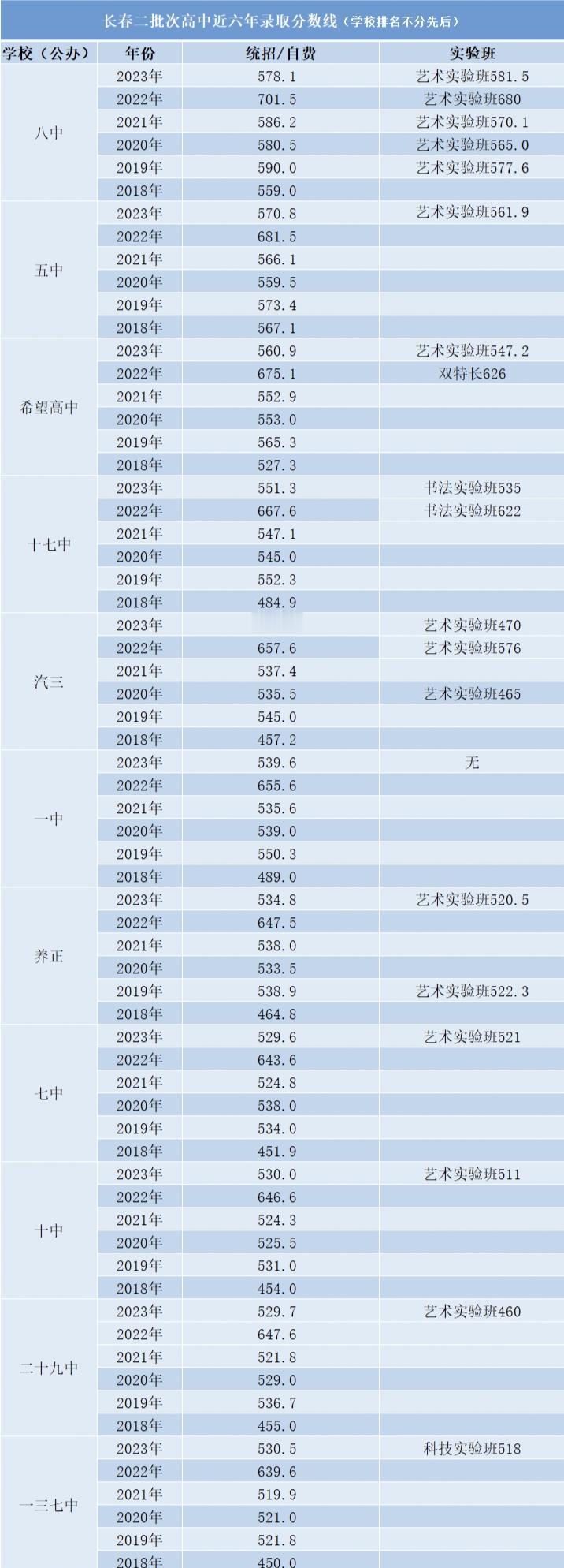 长春二批次高中近六年录取分数线 学校排名不分先后