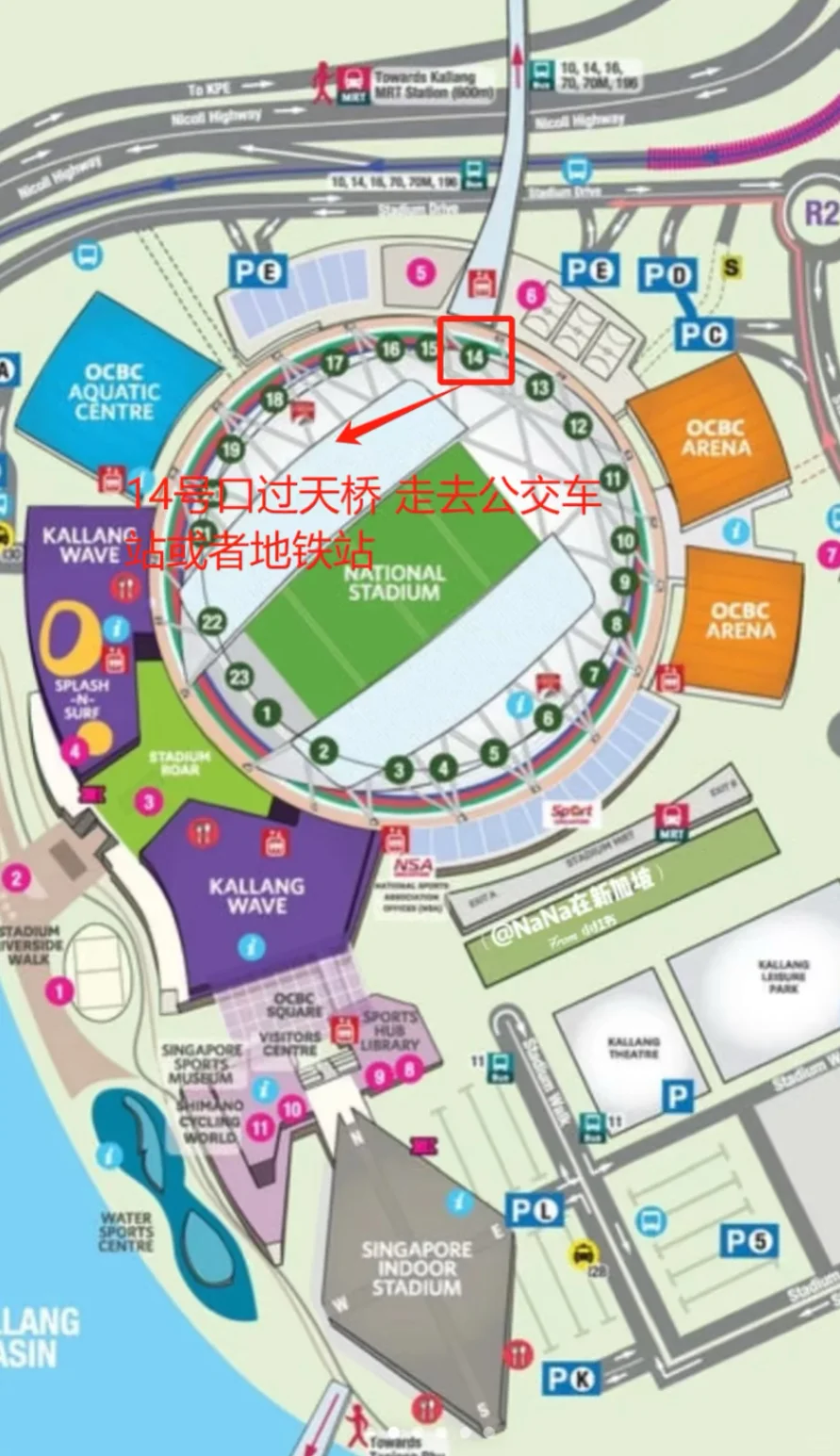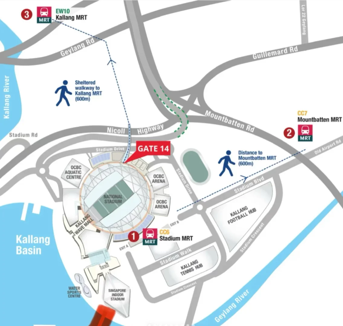 ✅步行去绿线MRT kallang站,体育场14号口有行人天桥 沿步道走600m,天桥底下有个公交站Nation Stadium,再往前走10分钟是公交站Aft Sims Way