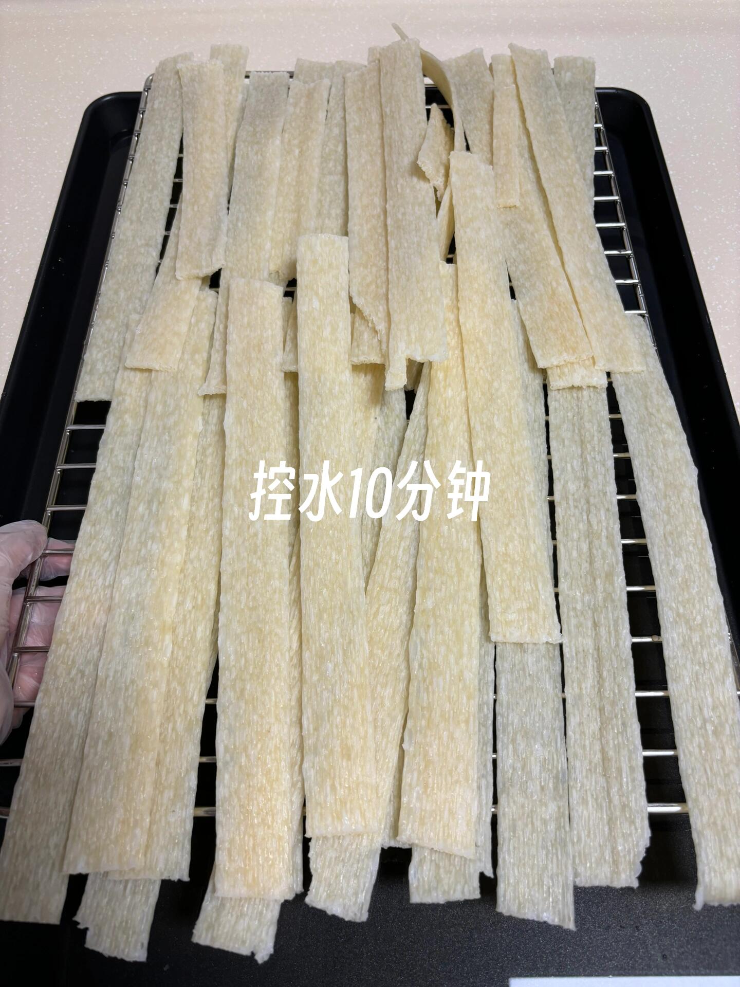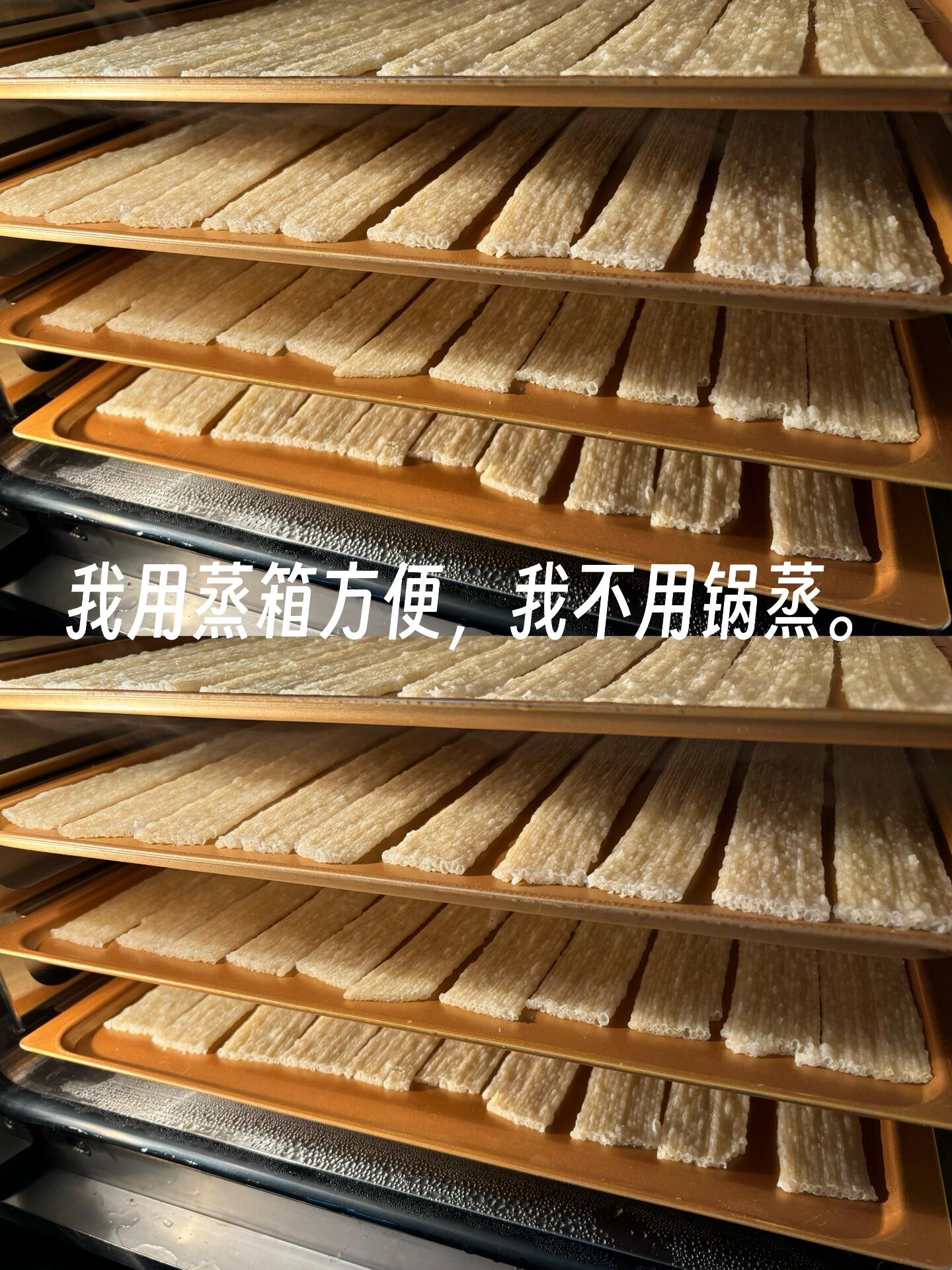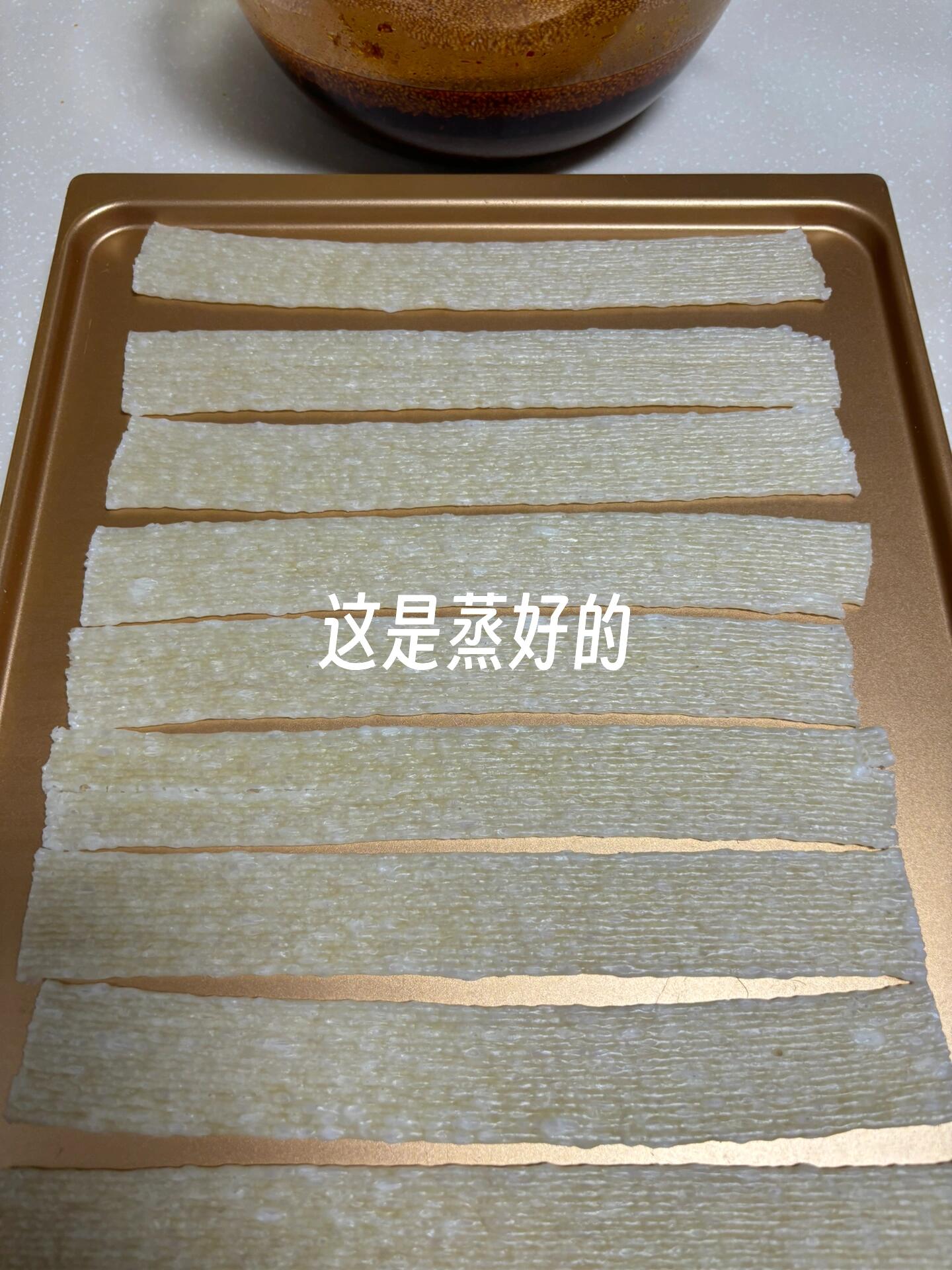 做法: 1、干牛筋面用凉水浸泡1-2分钟(图4),捞出控水10分钟(图5)。 2、绵白糖最后放,把除绵白糖之外的其他食材混合均匀,现在就等着泼热油激发香味了。 3、把葱油/大豆油/菜籽油加热到195度关火,用勺子把热油一勺一勺的泼在调料上,激发出香味。 4、控水后的辣条开始蒸:(怎么蒸❓❗️) (1)我用蒸箱,一次蒸5层,因为我是摆在蒸盘上,所以我蒸的牛筋面不会黏在一起(图9)。 (2)如果你用蒸锅,那么冷水上锅,水开后蒸5-6分钟,注意你需要给每一根牛筋面前后都刷上一层油,因为用锅蒸摆不开,牛筋面压牛筋面蒸好后会黏在一块,所以你需要给牛筋面刷油。 5、蒸好的牛筋面放在容器里,迅速加入凉白开,手戴手套把牛筋面和凉白开混合均匀,这一步是为了让牛筋面再次吸水,这样做牛筋面会完全分开并且不会变硬。 6、把牛筋面放入做好的调料油中完全抓匀,最后再加入绵白糖抓匀即可。