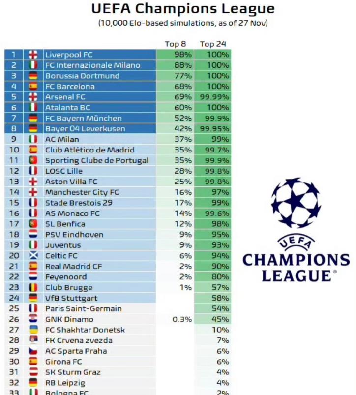 欧冠晋级前8概率!德甲三支球队有望都提前出线!皇马和曼城大概率要踢附加赛!巴黎可能要被淘汰出局! 现在五大联赛潜在的踢附加赛的队伍有: 意甲:AC米兰、尤文图斯 西甲:马竞、皇马 英超:曼城、切尔东 法甲:里尔、摩纳哥、布雷斯特 德甲:斯图加特 五大联赛要被淘汰的队伍有:巴黎、莱比锡红牛、博洛尼亚、赫罗纳