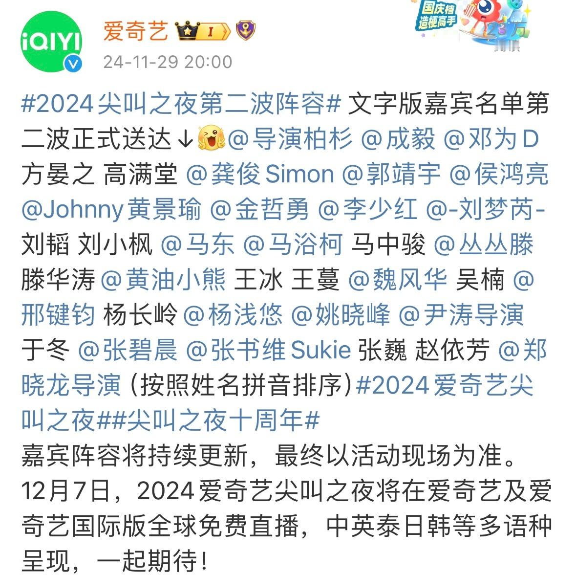2024爱奇艺尖叫之夜第二批阵容含金量又高了一层,🥝今年最后一个大活动咯