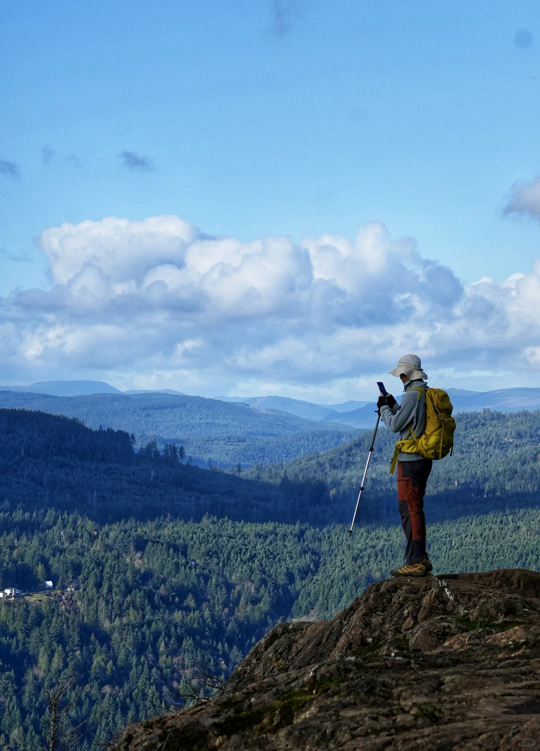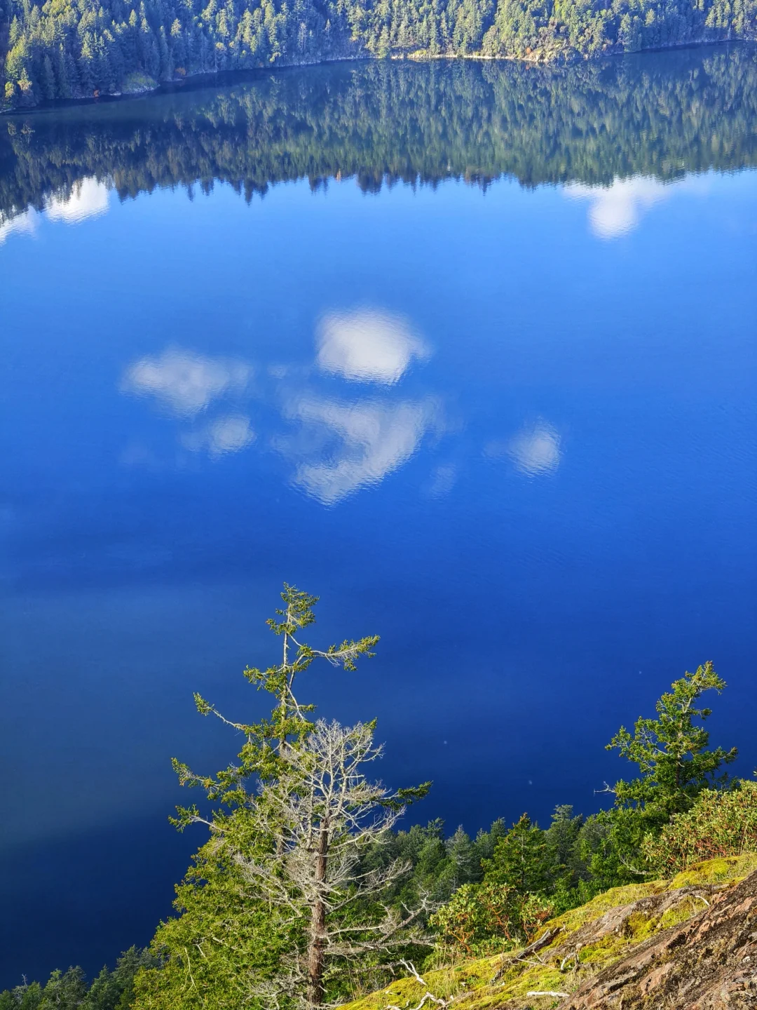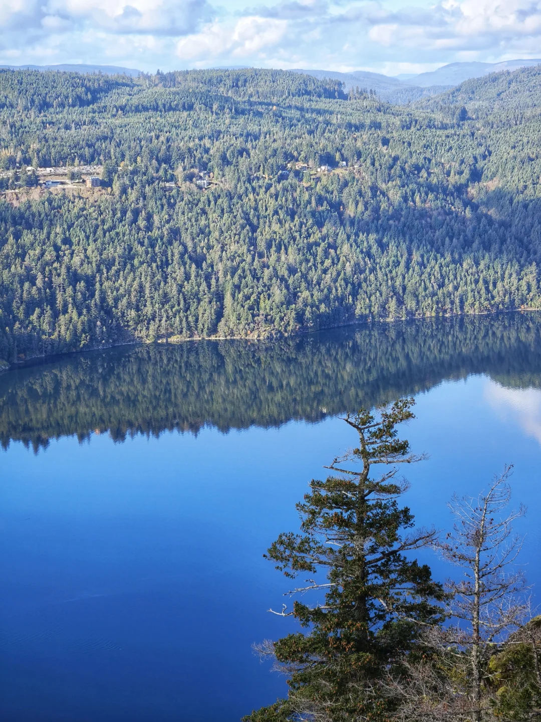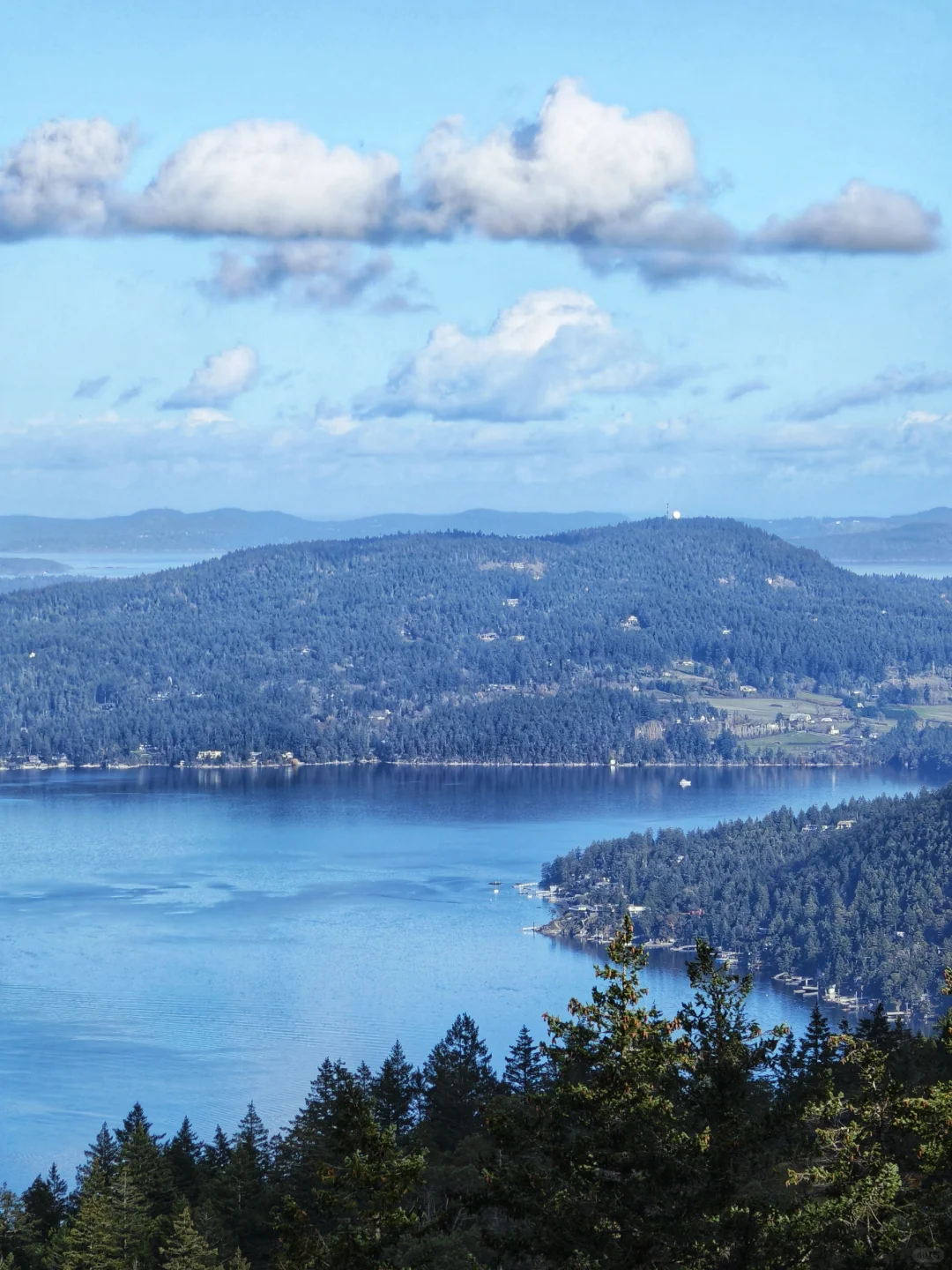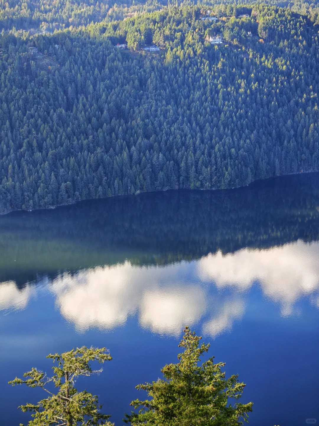 标题的“湖面如镜”其实是海面,爬升二三百米,便可轻松俯瞰峡湾风光,而这里也仅仅距离维多利亚市中心20余公里,开车30分钟左右便可抵达。