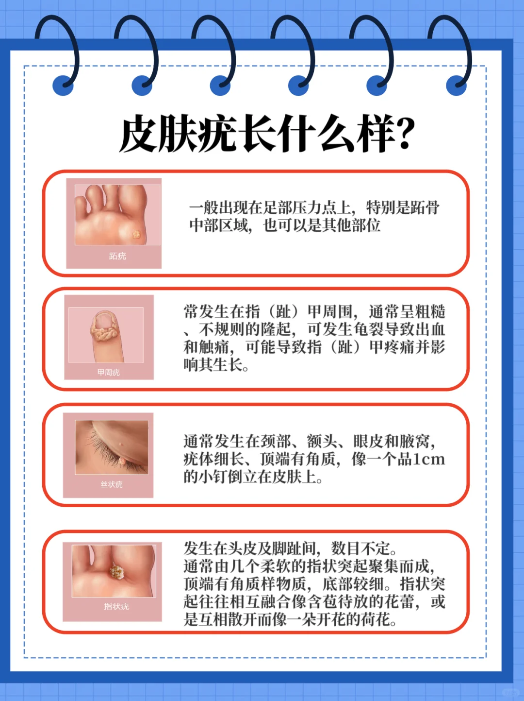 1、跖疣:一般出现在是足部压力点上,特别是跖骨中部区域,也可以是其他部位。