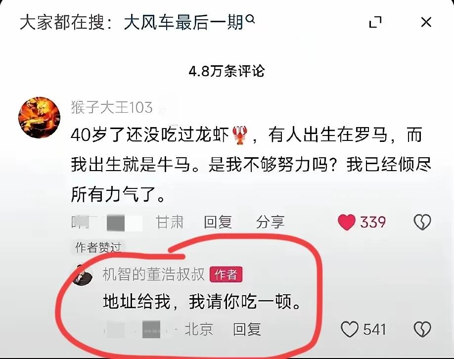 看哭了!一网友给董浩叔叔留言: “40岁了,还没吃过龙虾,有人出生在罗马,而我出生就是牛马。是我不够努力吗?我已经倾尽所有力气了。” 没想到却收到了董浩叔叔的回复: “地址给我,我请你吃一顿。” 短短10个字,让我一个大人破防了。 董浩叔叔说,现在最不容易的就是8090后。 董浩叔叔还是原来那个董浩叔叔, 曾经他带给我们快乐,现在他带给我们温暖。 昨晚睡不着,刷到他的视频,当太阳升起的时候,就是我们的再一次重生。