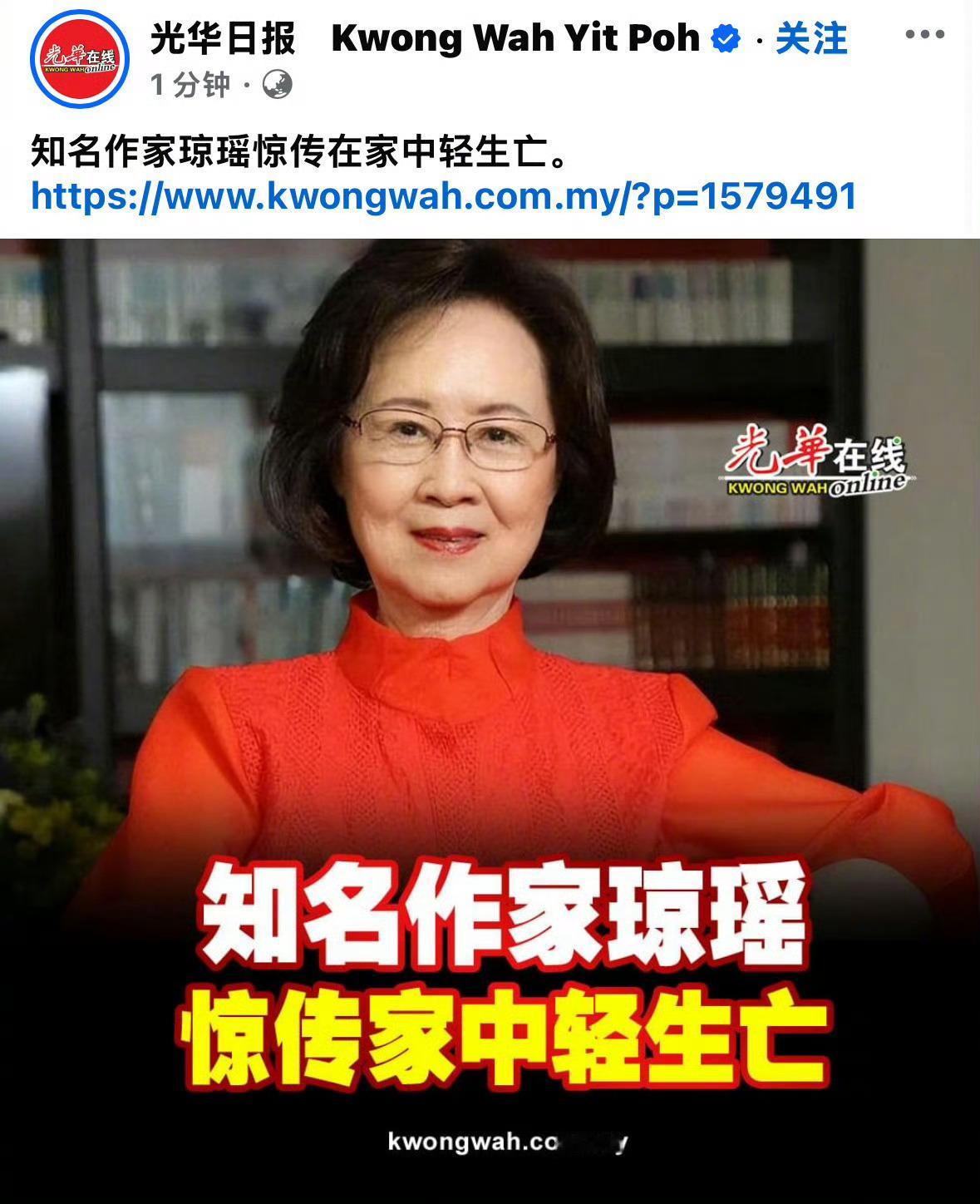 天啊,台媒称作家琼瑶今天下午在台湾轻生身亡🕯