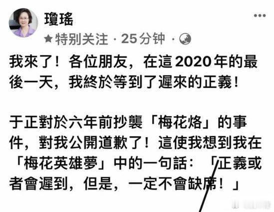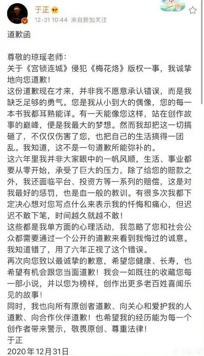 于正道歉:于正败诉后未按要求公开道歉,直到2018年4月26日此案进行强制执行。于正最终在2020年12月31日发文向琼瑶道歉,表示用了六年时间正视了这个错误,并表示自己在这六年的时间里除了赔款,还面临投资方和平台等一系列的赔偿。