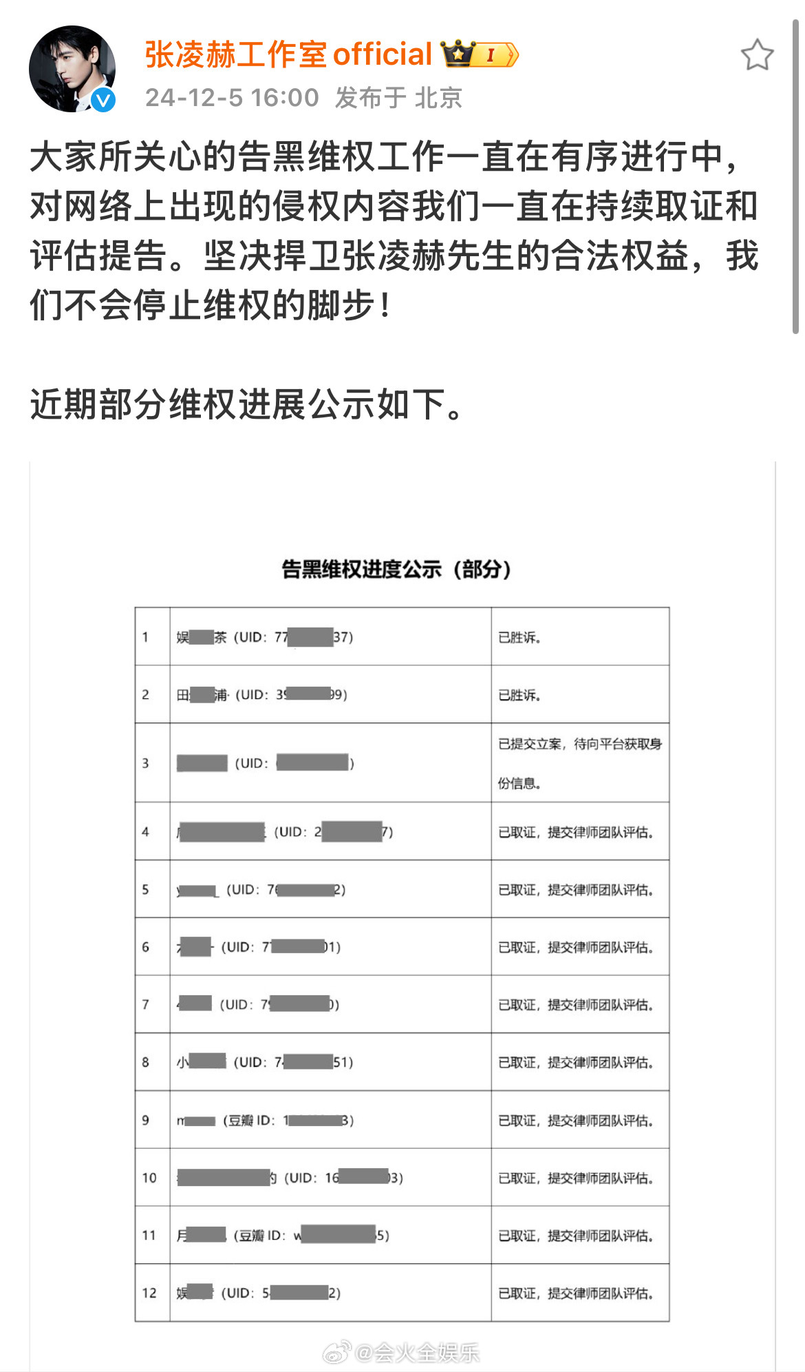 张凌赫工作室公示告黑维权进度