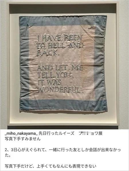这条帖子中展示了来自巴黎的艺术家路易丝·布尔乔亚的作品,作品上写着:“I have been to hell and back. And let me tell you, it was wonderful.(我刚从地狱回来,告诉你,真是太美好了。)”