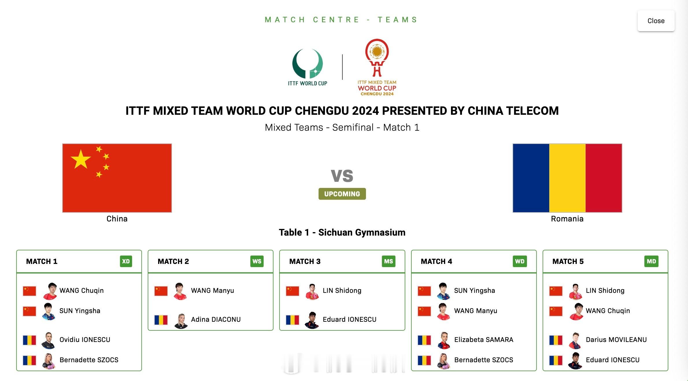 乒乓球混合团体世界杯 首场半决赛, 国乒混团vs罗马尼亚 。第4场、第5场的顺序和名单也已经确定。第4场如有的话,将是女双,国乒会派出孙颖莎/王曼昱。第5场男双,国乒派出的是林诗栋/王楚钦。