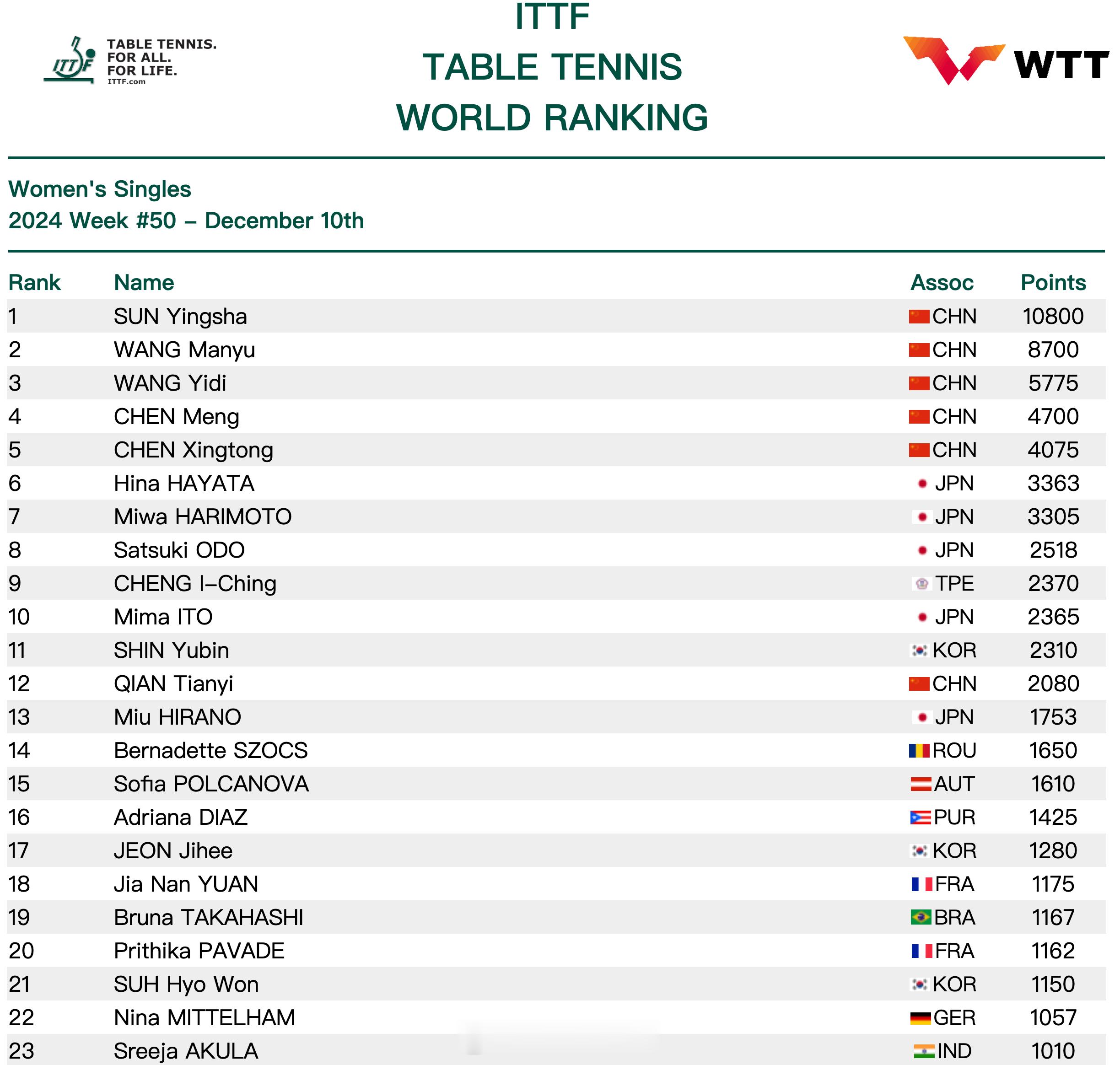 2024国际乒联第50周排名 国际乒联公布第50周的世界排名,国乒继续在四个项目上占据首位。