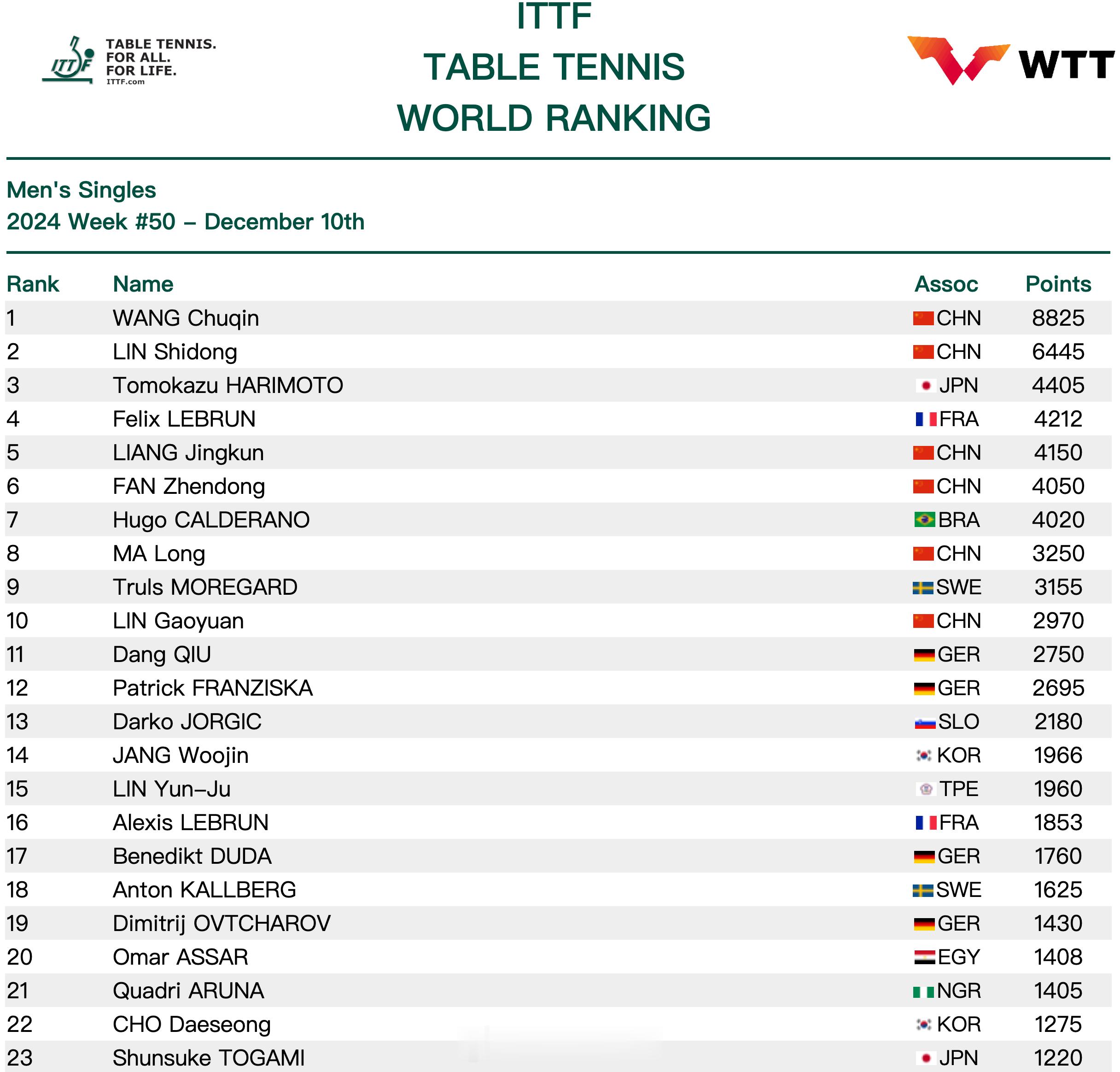 王楚钦、林诗栋排在男单前两位,日本的张本智和位居第3,法国的F-勒布伦第4,接下来是梁靖崑、樊振东。排名第7到第10的依次是雨果、马龙、莫雷加德和林高远。
