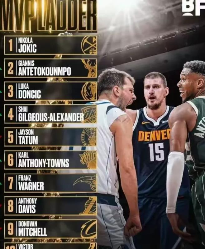 最新一期常规赛MVP排行榜,前四名分别为:约基奇、字母哥、东契奇、亚历山大。