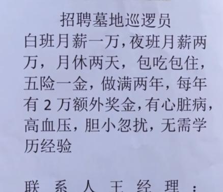 2024年5月,一34岁的中年男子应聘成为了一名墓地巡逻员,月薪高达18000元。工作内容简单至极:在墓地内漫步,心情愉悦,想下班时就尽情离去。 (信息来源:云上新闻《男子当墓地巡逻员月薪18000,巡查一圈后喝茶遛狗,晒现状太悠闲》2024-05-23) 什么是真正的好工作,对于这个人来说,和同事之间的矛盾越小越好,最好没有任何关系,因此这个男的找到了这个工作。 一个34岁的中年男人,原本在公司里也算个小领导,收入稳定,妥妥的人生赢家配置。突然有一天,人间蒸发了。朋友圈也不更新了,酒局也不去了,活像个“杀”进了平行宇宙的工具人。 几个月后,一条短视频揭开了谜底:他在墓地找到了新工作,月薪18000,工作内容是巡逻墓地,时间自由。这条消息一出,评论区瞬间热闹起来,有的人酸溜溜的,有的人羡慕不已,还有的提出了质疑,真是热闹非凡。 这个34岁的男人叫刘大懿。在此之前,他是公司中层,收入稳定,过着大多数人眼中标准的“人生赢家”生活。表面看起来光鲜,但背后却要面对不断的加班和压力。 每天早八晚十,生活被工作填满,曾经的理想和激情早已被消磨殆尽。直到他看到那条招聘广告——“墓地巡逻员,月薪18000,工作内容:巡逻墓地,时间自由”。 这个看似荒诞的机会,却像一颗种子,在他心中种下了对另一种生活的渴望。关于刘大懿的决定,网上议论纷纷,看法各不相同。 一部分人对他表示羡慕,认为他找到了“躺平”的终极奥义;另一部分人则质疑这份工作的真实性,认为其中可能另有隐情。毕竟,18000的月薪,工作内容只是在墓地里“散步”,这实在让人难以置信。 先不说刘大懿的个例,墓园工作本身就带有其特殊性。工作环境阴森,工作内容与“死亡”息息相关,长期在这种环境下工作,对心理素质的要求很高。即便是胆子再大的人,单独在寂静的墓园里巡逻,多少也会觉得有点冷。 此外,墓园通常位于偏远地区,生活配套设施可能不够完善,这也给工作带来了一定的不便。 更别说社交圈的狭窄,对习惯了都市生活的人来说,这种孤独感可能会难以承受。而且墓园工作也并非没有挑战。 除了日常巡逻,还需要应对各种突发情况,例如处理祭扫活动的安全问题、维护墓园的秩序等等。这工作得让那些既懂行又会随机应变的人来做。 刘大懿澄清道,那18000元的工资不仅仅是站岗巡逻的钱,还包含了剪枝、修设施等其他墓园管理工作。他坦言,这份工作并非适合所有人,但对他而言,内心的宁静和自由远比金钱更重要。 在辞职之前,刘大懿每天都活在高压之下,身心俱疲。连续加班和开会让他感觉像被拧紧的螺丝,生活变得没劲了。看到墓地巡逻员的招聘信息,他觉得有些荒诞,但内心深处却涌起一种莫名的渴望。 他巴不得远离吵闹,想要过上简单安静的日子。面试那天,刘大懿的心情十分复杂。他真没想到自己会做出这么不按常理出牌的选择。 面试过程很简单,主要是了解他能否适应这份工作的孤独与宁静。面试结束后,刘大懿几乎没有犹豫,就决定接受这份工作。 对此事,你怎么看?