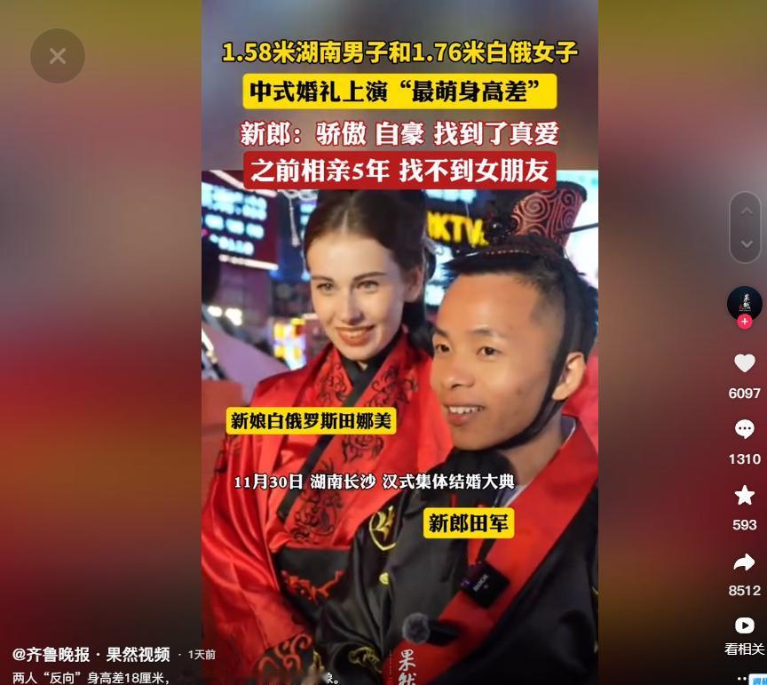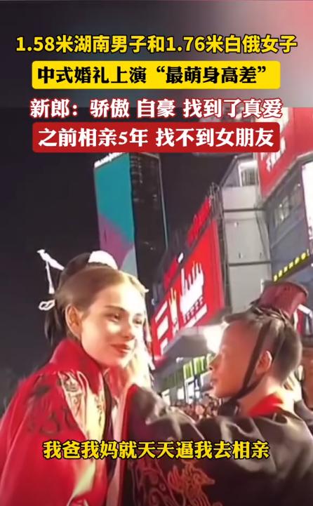 羡慕了!湖南一男子身高1.58米,相亲相了5年都没找到对象,本以为要打光棍一辈子,谁料,男子竟找到自己真爱,还是个不要彩礼、身高1.76米的白俄罗斯美女模特,俩人参加一场中式婚礼,反向“最萌身高差”惊艳众人,很多人觉得男子配不上新娘,但新娘却觉得这样的男生很难找!网友:被俄罗斯美女看上,说明有优点!那么俩人是如何走到一起的呢? 来源:观威海 1.58米湖南男子和1.76米白俄女子结婚,新郎:之前相亲5年找不到女朋友 2024-12-02 好啊,这恋爱要谈啊,看完这一对,不少人肯定会眼红,感叹别人的幸福,这样的爱情实在是让人羡慕。 一张照片,炸了朋友圈。中式婚礼现场,一对新人格外抢眼。不是因为豪车钻戒,也不是因为明星助阵,而是因为——身高差。新娘比新郎高出近20cm,这“反向最萌身高差”直接让网友们直呼:活久见! 新郎田军,湖南小伙,身高158cm。这位新娘叫娜美,是来自白俄罗斯的模特,个子有一米七六,皮肤白皙,长得漂亮,腿也很长。这组合,怎么看怎么“不搭”。 尤其在这个男多女少的年代,适婚男性普遍面临婚恋压力,而田军之前相亲五年都没成,一度以为自己要孤独终老。他居然娶了个外国模特,还是不要彩礼的呢。 这…剧本拿错了吧?田军的故事,远比照片更精彩。他的个头在找对象这方面不太占优势。一次次相亲失败,让他备受打击。但田军并没有因此放弃对生活的热爱,更没有自暴自弃。 他在一家酒店工作,负责管理模特团队。这份工作,成了他人生的转折点。一切,源于一个来自俄罗斯的模特团队。田军得管着这些模特的日常事务。 俊男靓女,颜值爆表,其中一个叫薇拉的女孩,尤其吸引田军的注意。薇拉热情开朗,田军对她展开追求,经常邀请她一起玩。薇拉的闺蜜娜美,也常和他们一起活动。 然而,薇拉对田军并没有感觉。由于语言不通,他们平时只能依靠电子翻译软件沟通,田军没能理解薇拉委婉的拒绝。田军直到薇拉开始有意冷淡他,才恍然大悟。 失恋的滋味不好受,好在有娜美在身边安慰和鼓励。两人从朋友做起,经常一起聊天、散步、看电影。经过一个多月的相处,两人渐渐熟悉,相互倾心,感情迅速升温。 跨国界、不论高矮,这段恋情就这么悄悄开始了。语言不通,是他们面临的最大难题。好在现在科技发达,电子翻译软件成了他们的沟通桥梁。虽然有时会因为翻译不准确闹出一些笑话,但这并没有影响他们的感情。 反而,这些“鸡同鸭讲”的经历,成了他们爱情故事中的调味剂。文化差异,也是一个挑战。白俄罗斯的风俗习惯跟咱们中国挺不一样的。为了更好地融入娜美的生活,田军开始学习俄语,了解白俄罗斯的文化。 娜美也对中国文化产生了浓厚的兴趣,学习中文、学习中国菜。他们用心去认识对方的文化,接受彼此的不同,最后找到了一个相处得好的方法。他们的爱情,并非一帆风顺。周围的质疑声,从未停止。 很多人觉得田军配不上娜美,觉得他是“癞蛤蟆想吃天鹅肉”。但娜美并不在意这些流言蜚语。她看中的是田军的善良、真诚和责任心,这些品质,比身高、外貌更重要。 在白俄罗斯,当地人结婚时,男方通常不用给女方彩礼。这对于田军来说,无疑减轻了经济压力。而对于娜美来说,她更看重的是爱情,而不是物质。 不久前,他们举办了一场中式婚礼。婚礼上,田军和娜美身着中式礼服,亮相惊艳。“反向最萌身高差”再次引发全场轰动。 娜美对着镜头坦言,尽管许多人觉得田军不够匹配她,但她觉得这样的男生实属难得。田军则一脸骄傲和自豪,能够娶到娜美,也是他的幸运。娜美的父亲也出席了婚礼,全程面带笑容,看得出来他对这个中国女婿非常满意。 你周围有异国婚恋的例子吗?他们幸福吗?