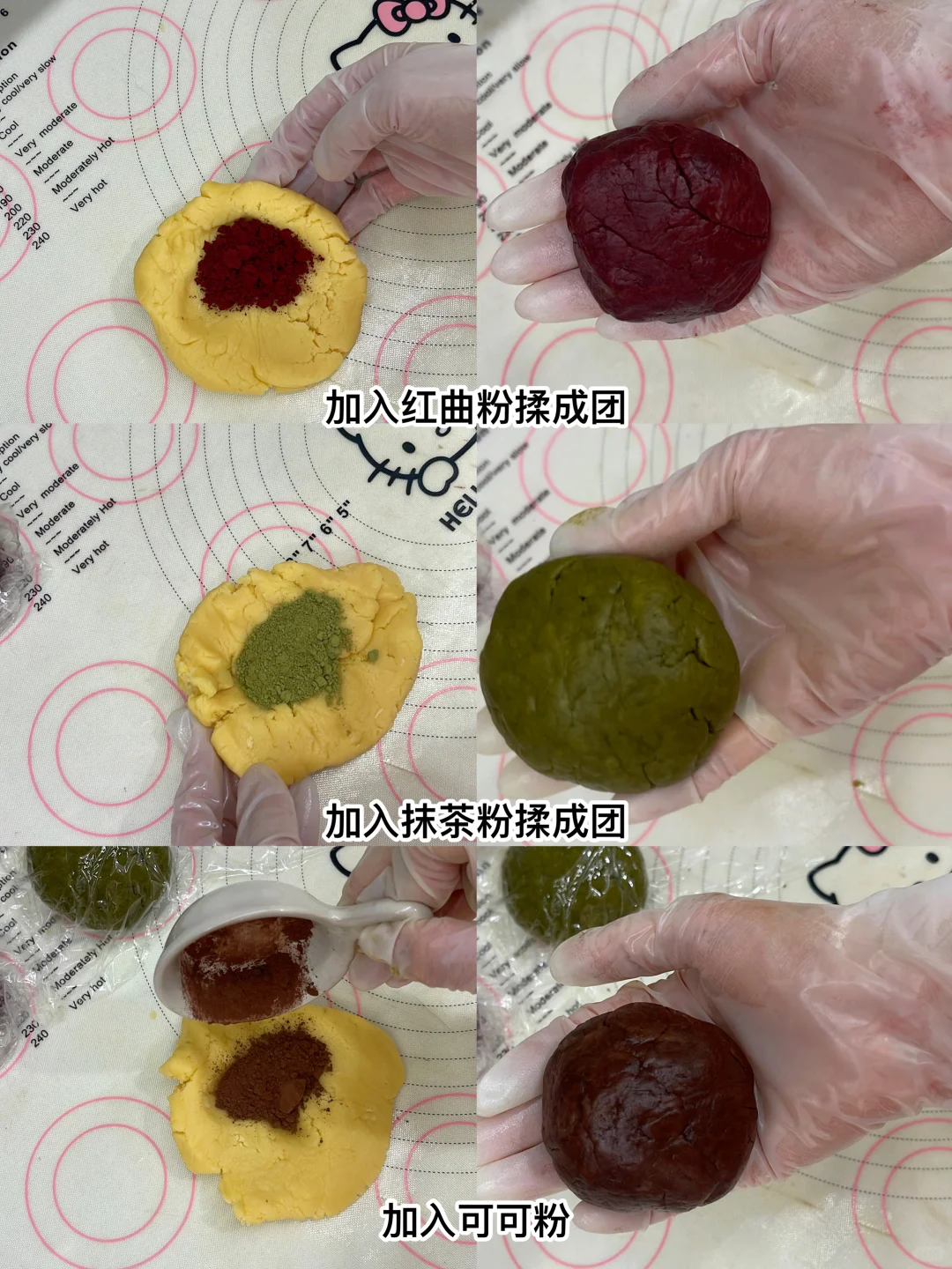 🔹把面团分成4份,一份原味,其他3份分别加入可可粉、抹茶粉、红曲粉揉成团.