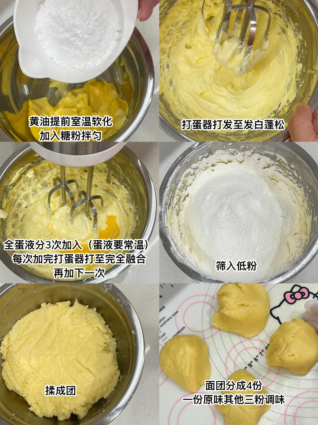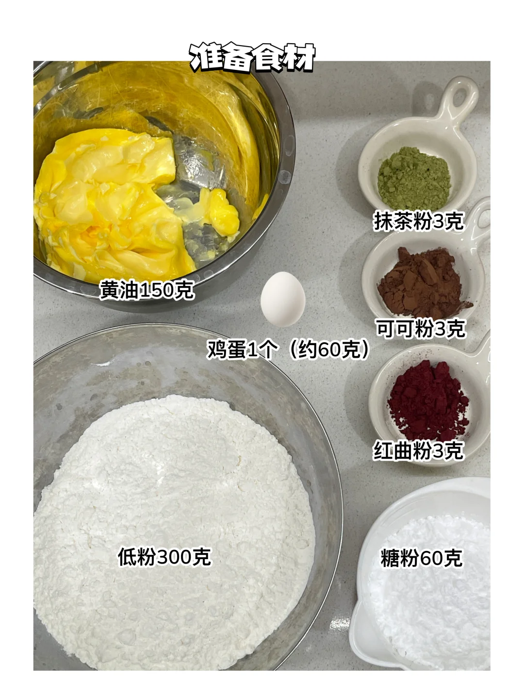 ✅准备食材:低粉300克、黄油150克、常温鸡蛋1个(蛋液约60克)、糖粉60克、抹茶粉3克、红曲粉3克,可可粉3克..
