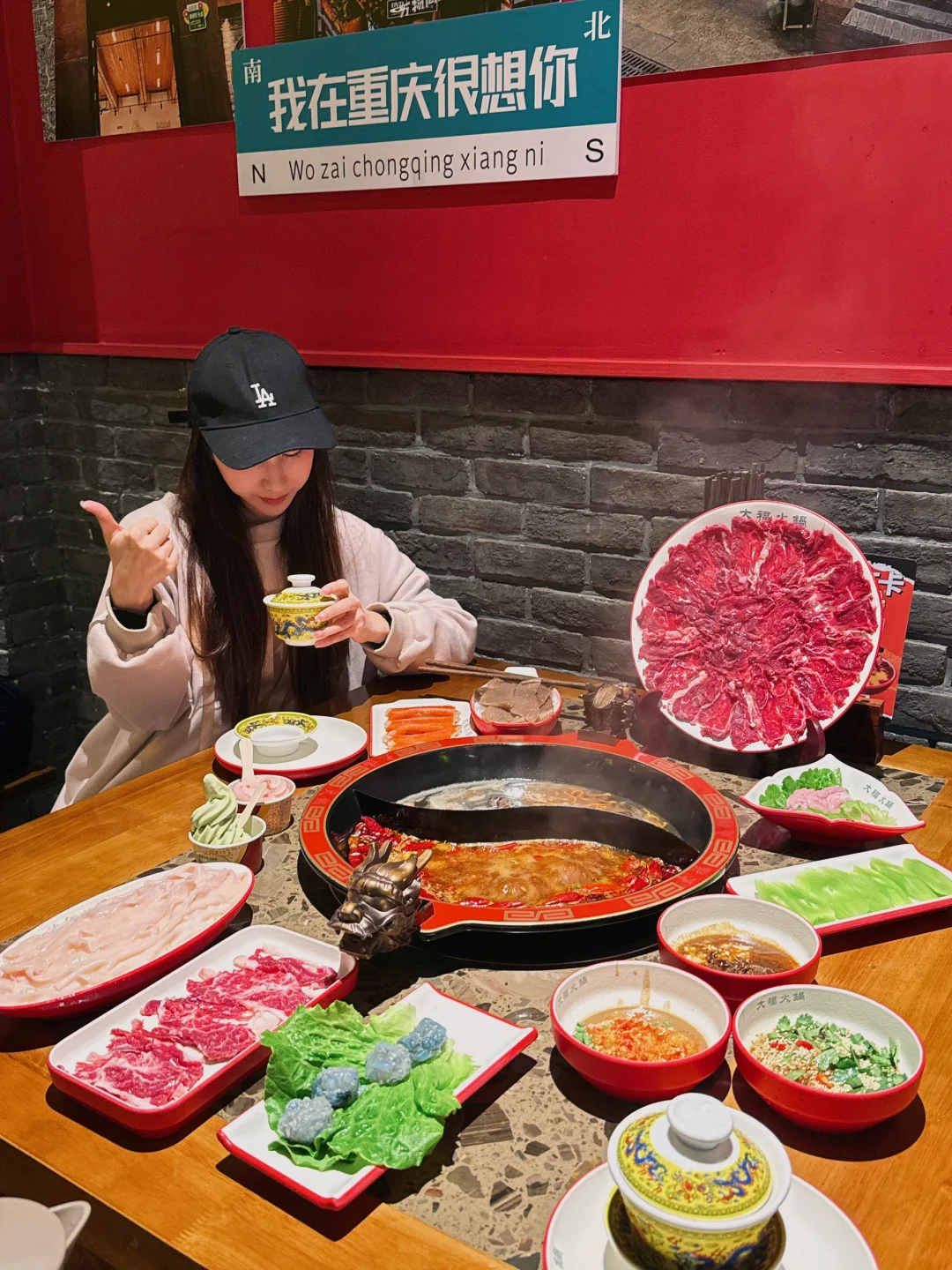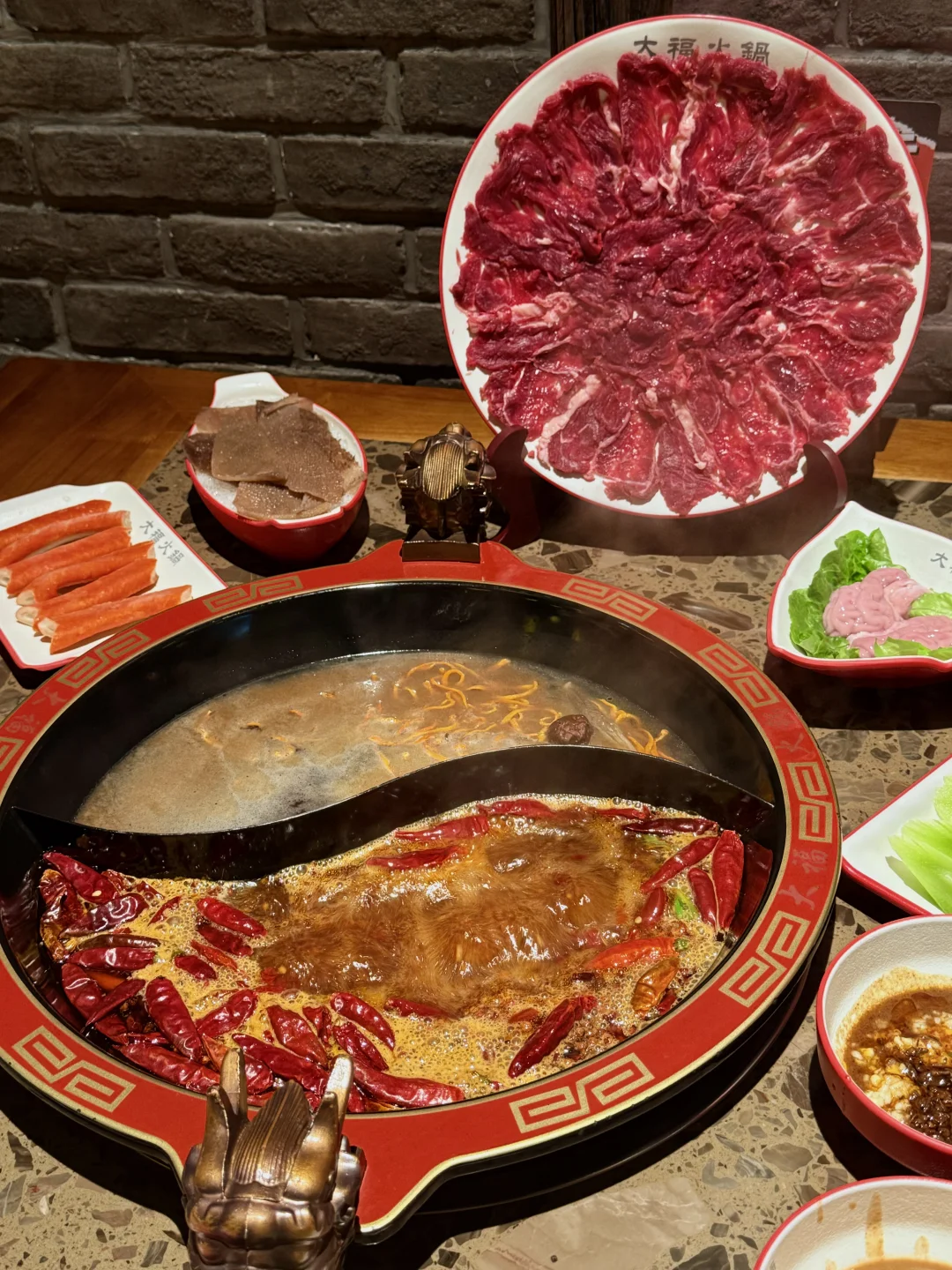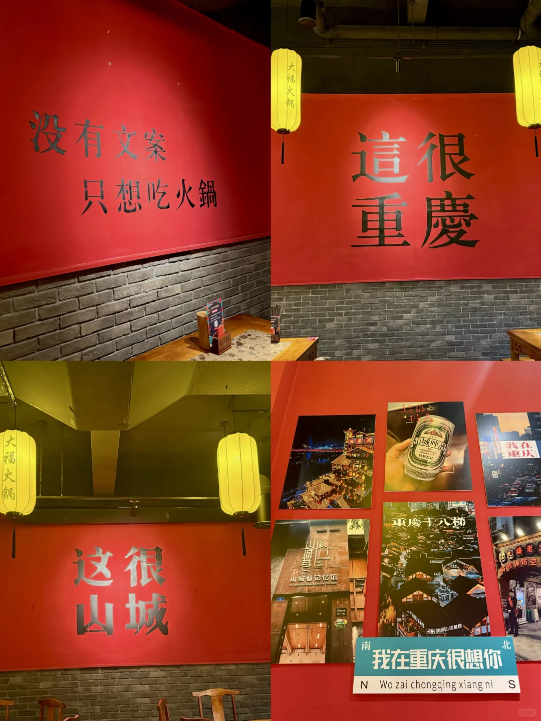 · 🔥冬天就得吃火锅 火锅就🉐吃重庆的! 😁这家火锅店已经n刷了~ · 🏮装修浓浓的喜庆感,烟火气十足 👏店里的毛笔字 超接地气~ · ✅我们点了麻辣➕菌汤锅底 🌟菜品点了毛肚、吊龙、雪花、鹅肠、猪脑、蟹棒、虾滑…食材新鲜~ 🤩正宗的重庆锅底 再加上酱料! 🉑真的ju好吃! · 🥹而且~他家冰淇淋任吃!糖水任吃 😋太满足啦~ · 📍山峸大福火锅 ⏰11:00~02:00 ·